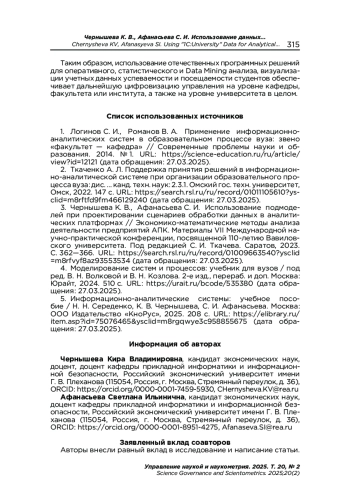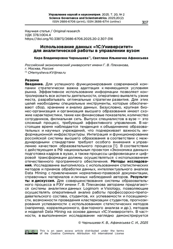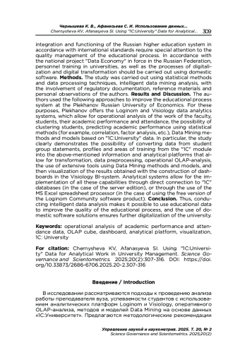 Результаты и дискуссия. Для совершенствования системы образовательного процесса в РЭУ имени Г. В. Плеханова авторами предлагаются системы аналитики данных Loginom и Visiology, позволяющие осуществлять оперативный анализ работы профессорско-преподавательского состава, студентов, их успеваемости и посещаемости, возможности проведения кластеризации студентов, прогнозирования успеваемости с использованием статистических методов (например, корреляционного, факторного анализа и др.), методов и моделей Data Mining на основе данных «1С: Университет». В частности, в выполненном исследовании наглядно демонстрируется возможность преобразования данных ведомостей групп студентов, профилей и направлений подготовки из модуля «1С» в вышеназванные информационно-аналитические платформы, позволяющие осуществлять трансформацию, предобработку данных, проводить оперативный OLAP-анализ, использовать обширный инструментарий c использованием Data Mining методов и моделей, а затем осуществлять визуализацию полученных результатов с построением дашбордов в BI-системе Visiology. Аналитические системы позволяют реализовать все эти возможности посредством подключения напрямую к базам данных «1С» (в случае серверной редакции), либо через использование табличного процессора MS Excel (в случае использования бесплатной версии программного продукта Loginom Community).