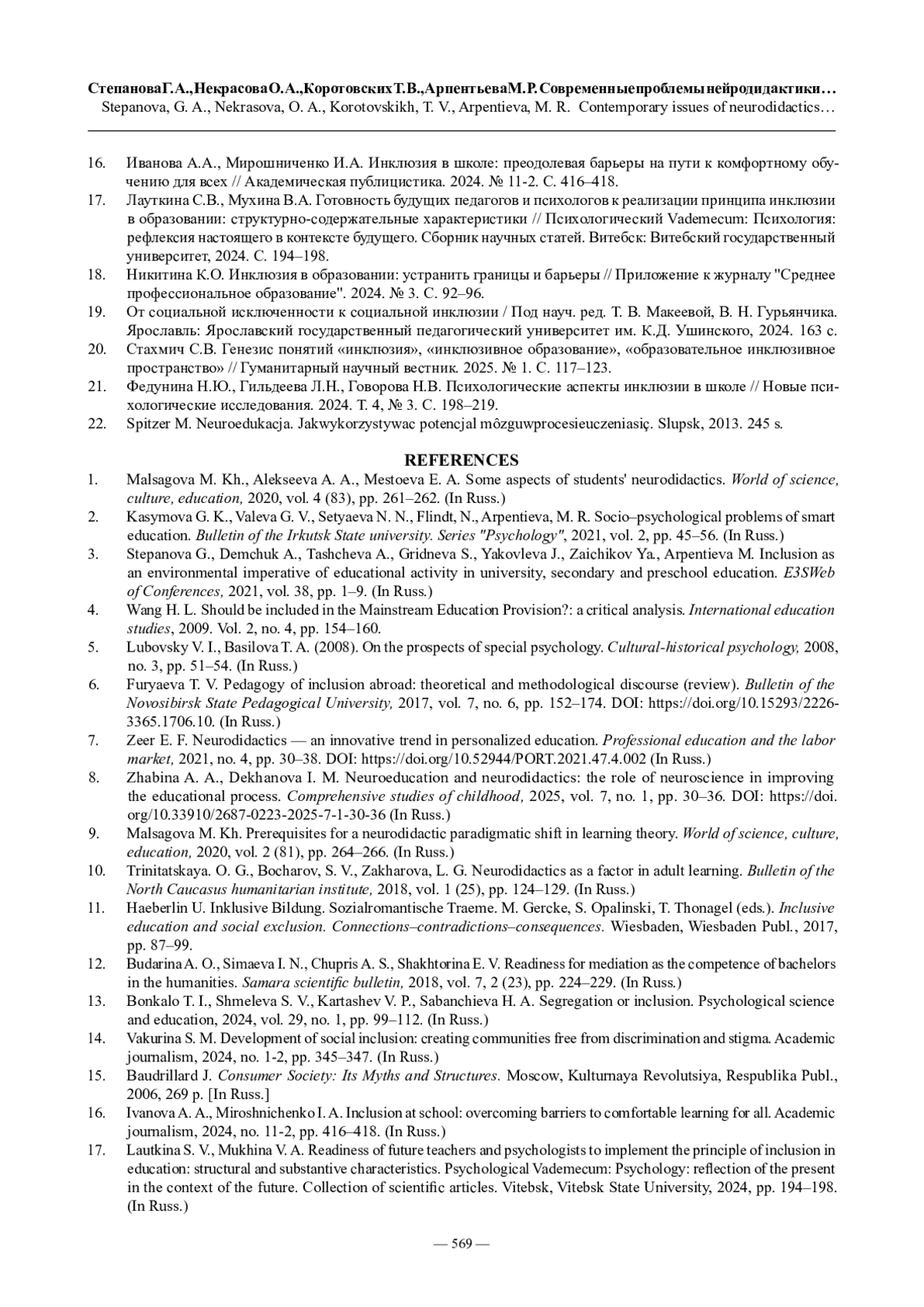 1. Мальсагова М. Х., Алексеева А. А., Местоева Е. А. Некоторые аспекты нейродидактики студентов // Мир науки, культуры, образования. 2020. № 4 (83). С. 261-262.