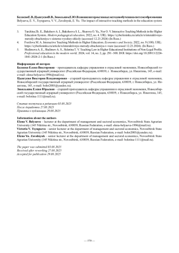 Выводы. На основе анализа влияния интерактивных методов обучения целесообразно рекомендовать более широкое и активное их применение в образовательном процессе. Это поможет улучшить обучение, повысить его эффективность и подготовить выпускников, способных успешно адаптироваться к требованиям современной профессиональной среды.