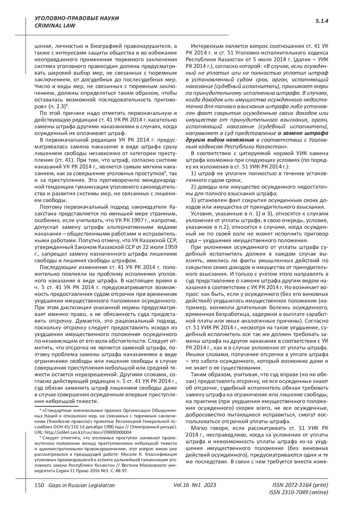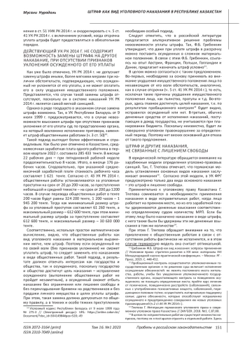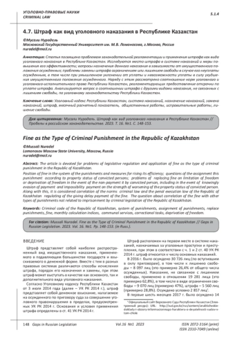 МУСАЛИ Н. ШТРАФ КАК ВИД УГОЛОВНОГО НАКАЗАНИЯ В РЕСПУБЛИКЕ КАЗАХСТАН // ПРОБЕЛЫ В РОССИЙСКОМ ЗАКОНОДАТЕЛЬСТВЕ. 2023. Т. 16 № 1