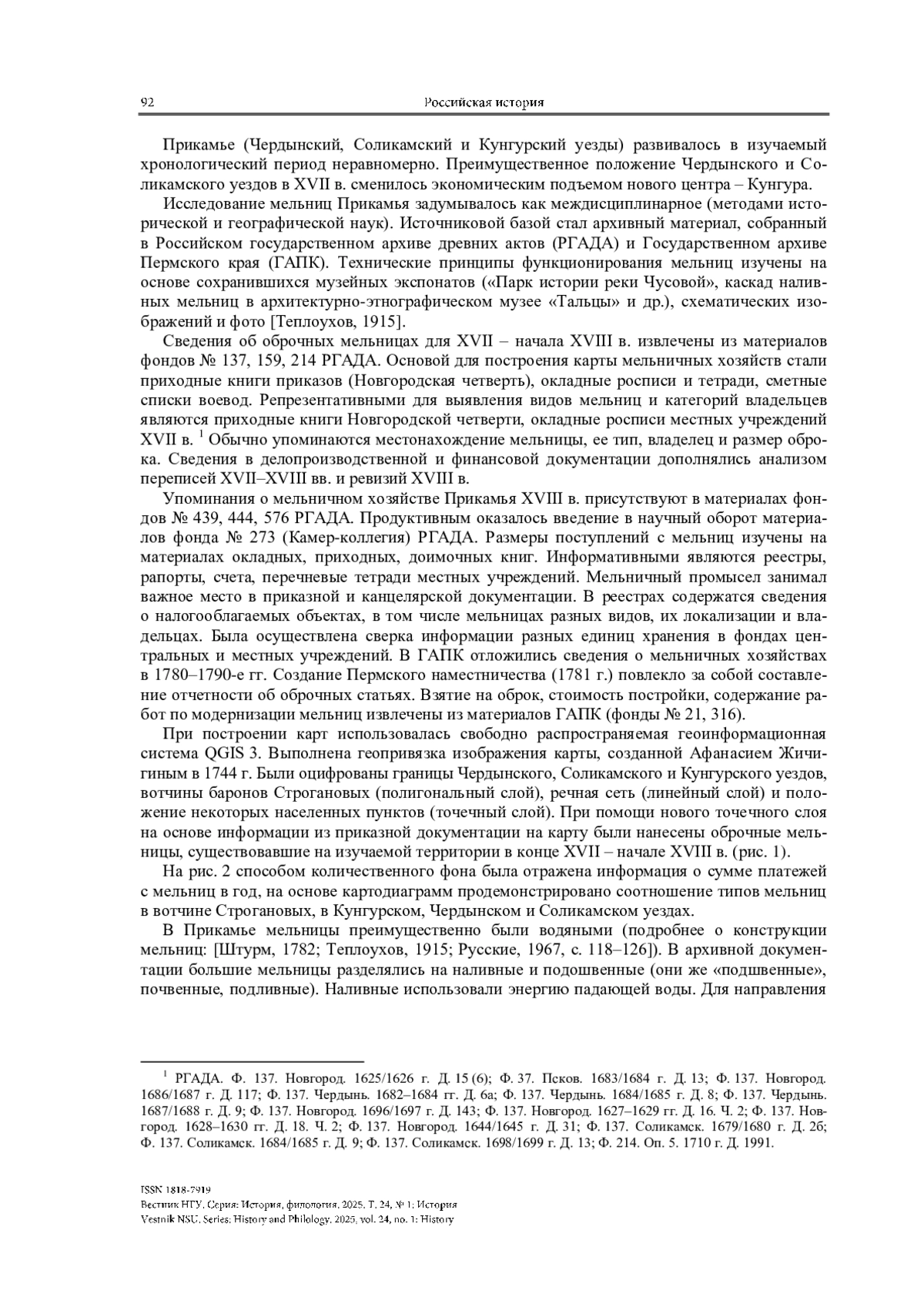 Изучено мельничное хозяйство на территории Прикамья в XVII–XVIII вв. Сведения об оброках с мельниц извлечены из приходных книг Новгородского приказа, сметных списков, переписей, реестров, рапортов, перечневых тетрадей, донесений в центральные и местные учреждения. Оценены размеры денежных поступлений в государственную казну, локализованы районы размещения мельниц. Определены типы конструкций мельниц, рассмотрен социальный состав владельцев крупных объектов. Наличие большого числа мельниц свидетельствует о высоком уровне гидротехнических работ. Определены основные тенденции развития мельничного хозяйства Прикамья на протяжении XVII–XVIII вв.