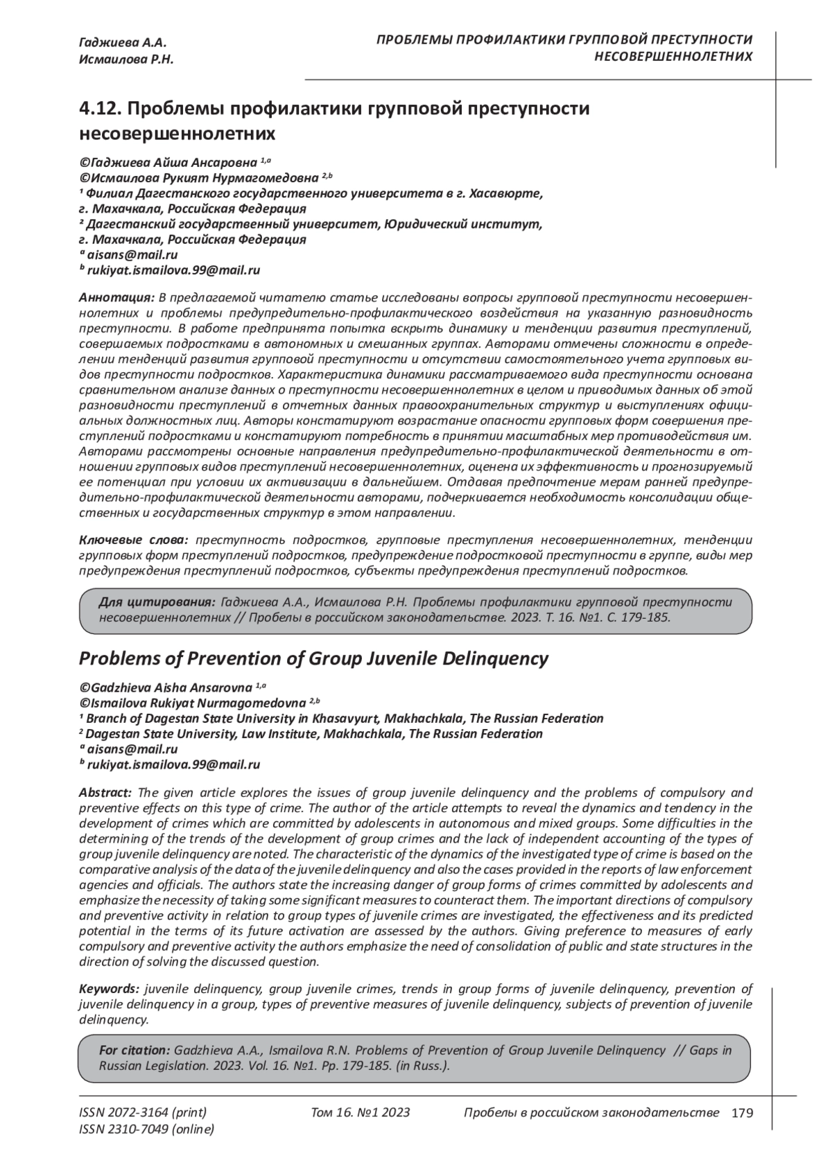 В предлагаемой читателю статье исследованы вопросы групповой преступности несовершеннолетних и проблемы предупредительно-профилактического воздействия на указанную разновидность преступности. В работе предпринята попытка вскрыть динамику и тенденции развития преступлений, совершаемых подростками в автономных и смешанных группах. Авторами отмечены сложности в определении тенденций развития групповой преступности и отсутствии самостоятельного учета групповых видов преступности подростков. Характеристика динамики рассматриваемого вида преступности основана сравнительном анализе данных о преступности несовершеннолетних в целом и приводимых данных об этой разновидности преступлений в отчетных данных правоохранительных структур и выступлениях официальных должностных лиц. Авторы констатируют возрастание опасности групповых форм совершения преступлений подростками и констатируют потребность в принятии масштабных мер противодействия им. Авторами рассмотрены основные направления предупредительно-профилактической деятельности в отношении групповых видов преступлений несовершеннолетних, оценена их эффективность и прогнозируемый ее потенциал при условии их активизации в дальнейшем. Отдавая предпочтение мерам ранней предупредительно-профилактической деятельности авторами, подчеркивается необходимость консолидации общественных и государственных структур в этом направлении.