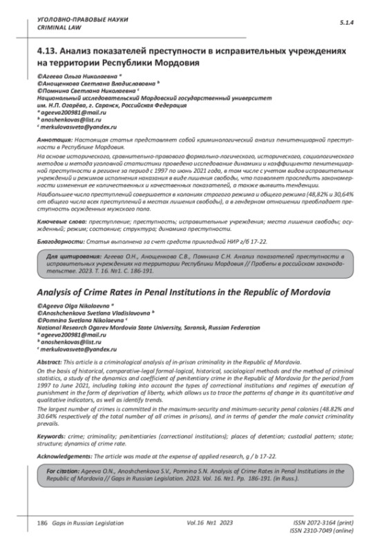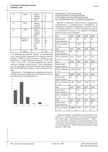 В продолжение идей, отраженных в статьях «Иссле - дование пенитенциарной преступности в Республике Мордовия: введение в проблему» и «Структура пре - ступности в исправительных учреждениях на терри - тории Республики Мордовия», используя положения, выработанные в указанных публикациях, учитываем следующие положения. Масштабы пенитенциарной преступности не отли - чаются критическими цифрами, но ее общественная опасность более чем очевидна: преступления совер - шаются лицами, уже осужденными к лишению свобо - ды за ранее совершенные преступления, как правило, относящиеся к тяжким и особо тяжким. Совершение преступлений в условиях контроля со стороны адми - нистрации ФСИН умаляет авторитет этого ведомства.