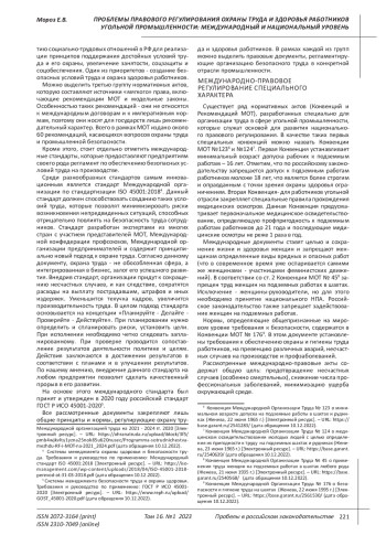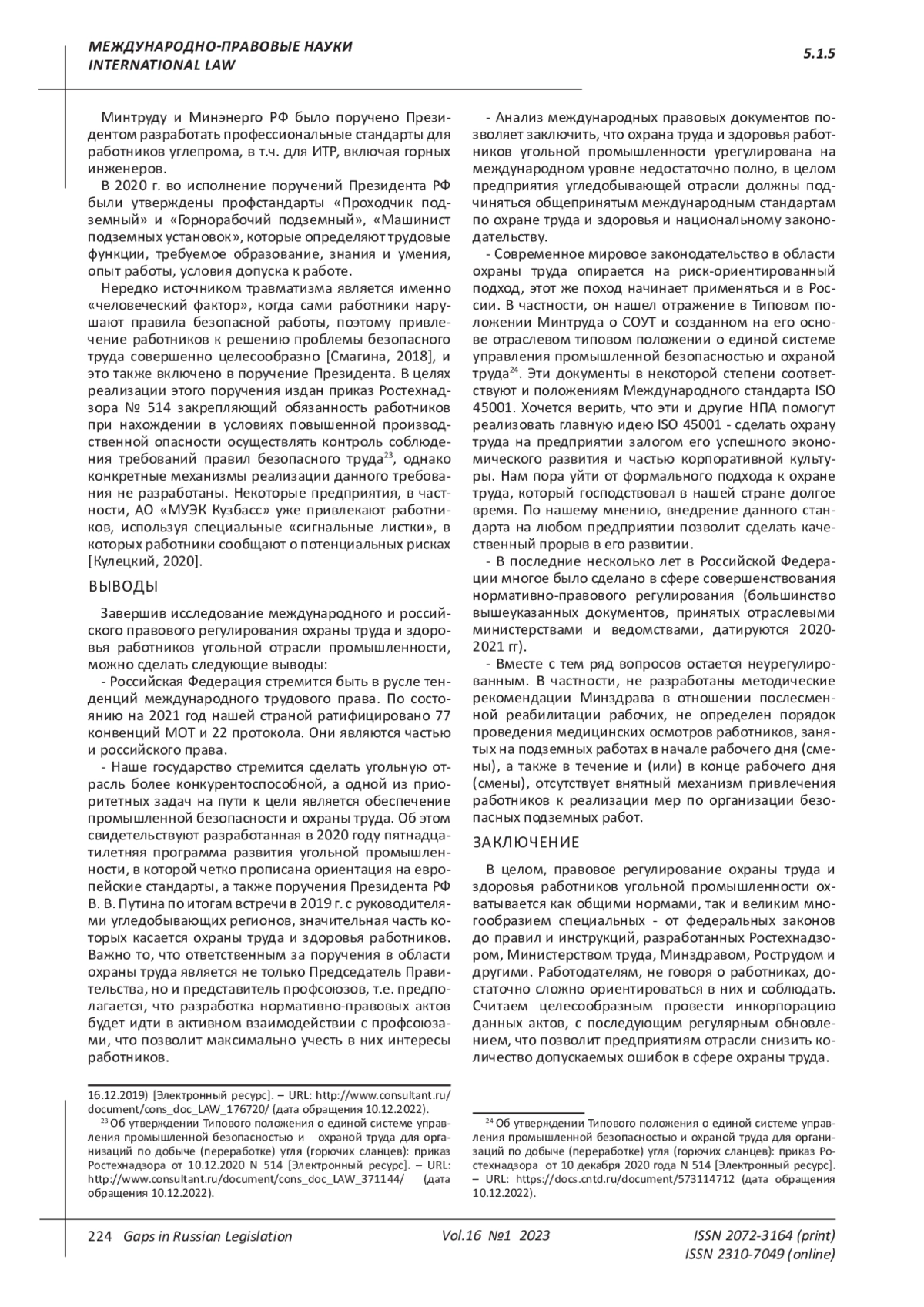 Цель исследования. Целью настоящего исследования является анализ и сравнение действующих международных и российских нормативно-правовых актов, регулирующих сферу охраны труда и здоровья работников угольной отрасли, выявление недостатков и выработка рекомендаций по совершенствованию российского законодательства. Помимо российского законодательства для регулирования охраны труда и здоровья работников угольной промышленности значительную роль играют международные правовые нормы, которые вырабатывались десятилетиями и аккумулировали в себе наиболее ценный и значимый опыт различных национальных норм. В статье выявляются современные тенденции и приоритеты, дается оценка соответствия национального законодательства в области охраны труда международному, выявляются достоинства и недостатки. Разработка и принятие новых национальных нормативно-правовых актов по охране труда и промышленной безопасности в соответствии с учетом мировой практики должны способствовать повышению производительности труда угольных предприятий и увеличению их конкурентоспособности.