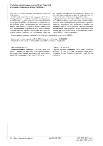 В статье приводится авторский взгляд на учебник “Право интеллектуальной собственности: художественная собственность”, опубликованный в 2019 году в ООО “Научно - издательский центр ИНФРА-М. Проводится краткий анализ рассмотренных в учебном издании тем. Делается вывод о выполнении учебником мотивационной, информационной и систематизирующей функций. В процессе рецензирования был сделан вывод о наличии в учебном пособии необходимого и качественного дидактического материала, корректно подобранных заданий для самоконтроля обучающихся, а также дополнительных элементов справочно-сопроводительного аппарата.