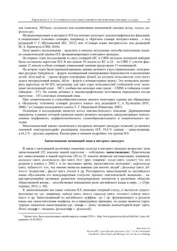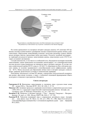 Представлены результаты структурно-семантического анализа номинаций лица, функционирующих в интернет-дискурсе. Деривационная парадигма, в рамках которой проанализированы 145 лексем (состав картотеки определен на основе речевых и лексикографических источников), предусматривает использование морфемного, морфонологического, словообразовательного и семантического методов. Установлены основные способы пополнения лексикона номинаций лица: 35,8 % единиц – заимствования; 64,2 % – русские дериваты. Практически все заимствования в картотеке – англицизмы, уникальны случаи заимствования из японского языка (2 лексемы из 52). Образование номинаций лица на базе русского языка происходит посредством семантической деривации, аффиксации, словосложения, сращения, фонетического усечения. Суффиксация оказывается наиболее продуктивным способом (доля суффиксальных дериватов – 66 %, выделено 13 различных формантов, образующих неологизмы со значением ‘человек’).