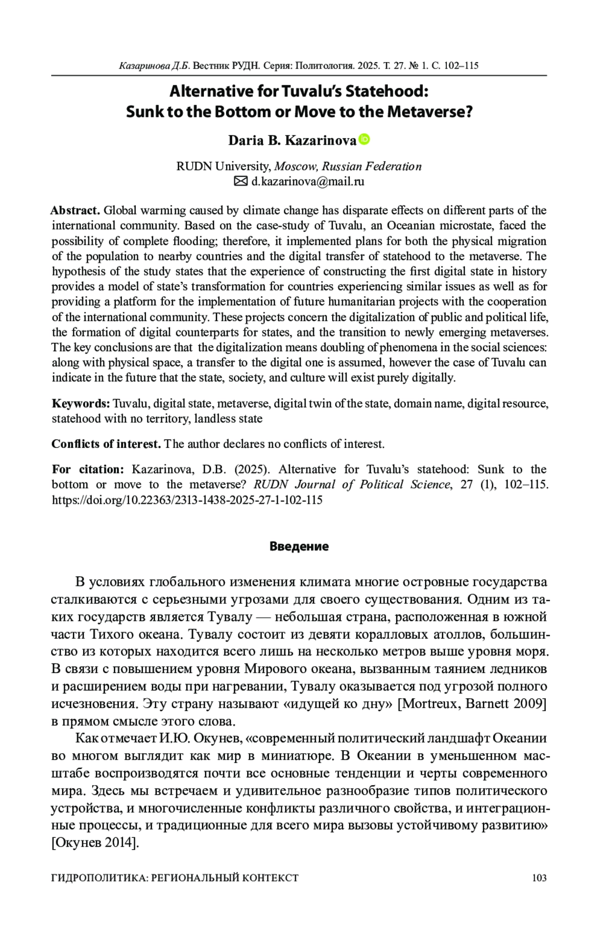 Глобальное потепление вследствие климатических изменений производит неравные эффекты для различных государств международного сообщества. На основе кейс-стади опыта микрогосударства Тувалу в Океании, которое оказалось перед угрозой полного затопления, показано, как, совмещая меры по физической миграции населения в соседние страны и цифровой миграции государственности в метавселенную, решается вопрос о будущности государственности в новых условиях. Гипотеза исследования состоит в том, что опыт создания первого в истории цифрового государства представляет собой как модельный образец для стран, столкнувшихся с подобными вызовами, так и в качестве примера становления при поддержке международного сообщества платформы для реализации будущих инициатив человечества, связанных с цифровизацией общественной и политической жизни, создания цифровых двойников государств, а также переходом в метавселенные, которые сейчас находятся лишь на стадии формирования. Ключевые выводы заключаются в том, что в социальных науках цифровизация подразумевает ситуацию удвоения: наряду с физическим пространством предполагается переход в цифровое, однако кейс государства Тувалу может продемонстрировать в перспективе исключительно цифровое существование государства, социума и его культуры.
