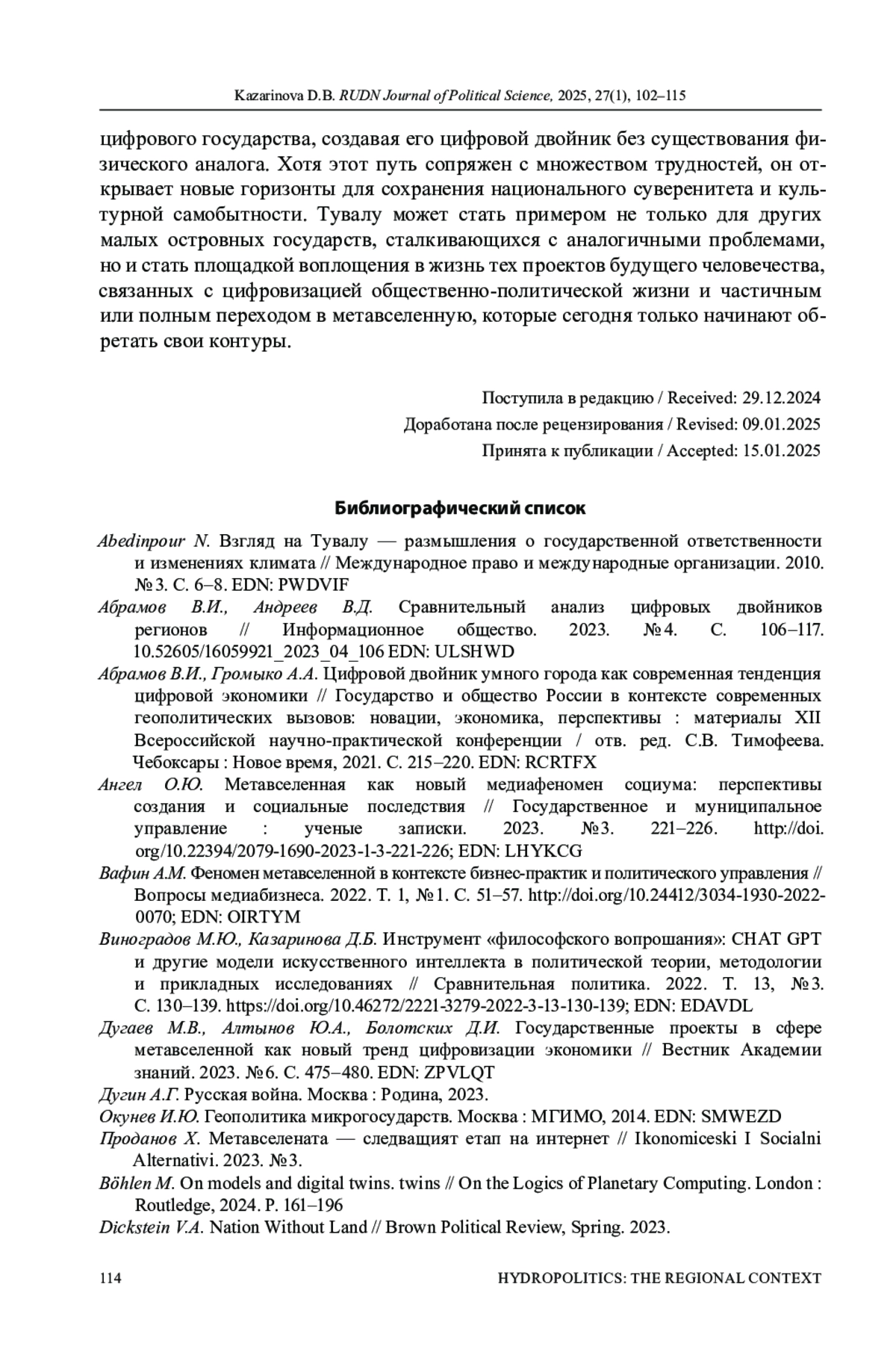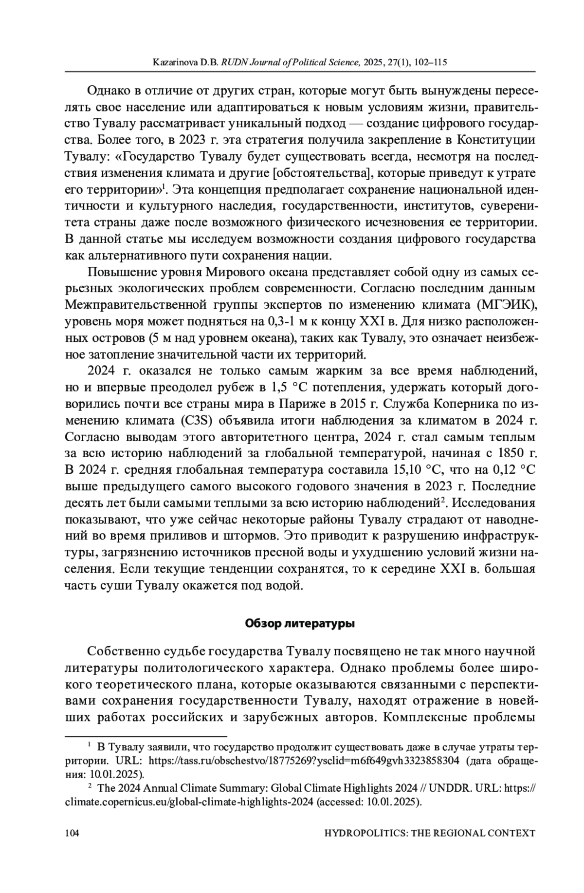 19. Rothe D. et al. Digital Tuvalu: state sovereignty in a world of climate loss // International Affairs. 2024. Vol. 100. no. 4. P. 1491-1509. DOI: 10.1093/ia/iiae060 EDN: VRPVAE