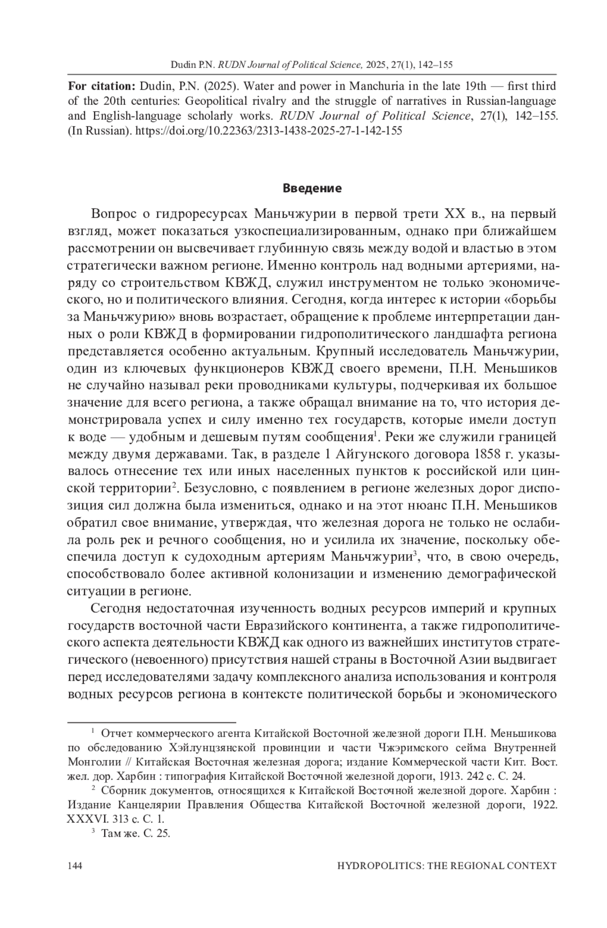 Вопрос о гидроресурсах Маньчжурии в первой трети XX в., на первый взгляд, может показаться узкоспециализированным, однако при ближайшем рассмотрении он высвечивает глубинную связь между водой и властью в этом стратегически важном регионе. Именно контроль над водными артериями, наряду со строительством КВЖД, служил инструментом не только экономического, но и политического влияния. Сегодня, когда интерес к истории «борьбы за Маньчжурию» вновь возрастает, обращение к проблеме интерпретации данных о роли КВЖД в формировании гидрополитического ландшафта региона представляется особенно актуальным.