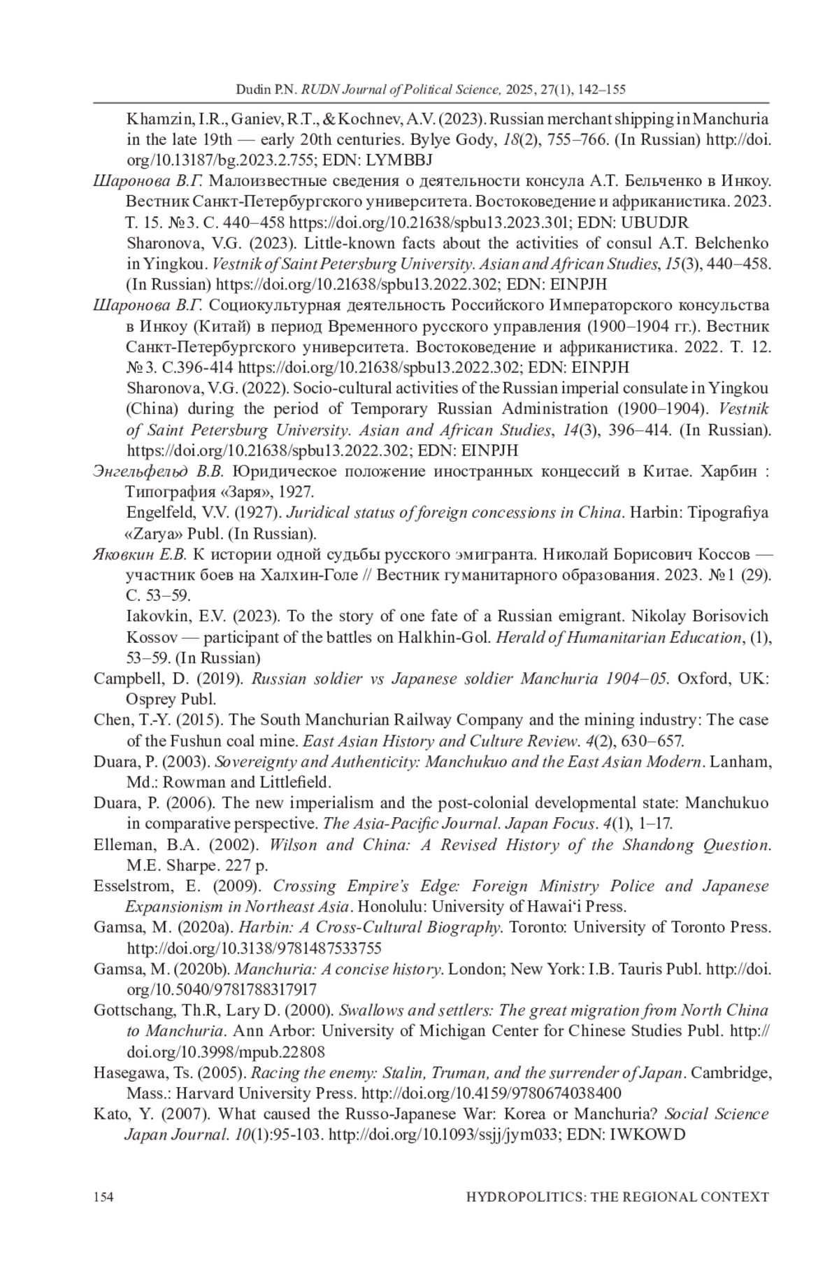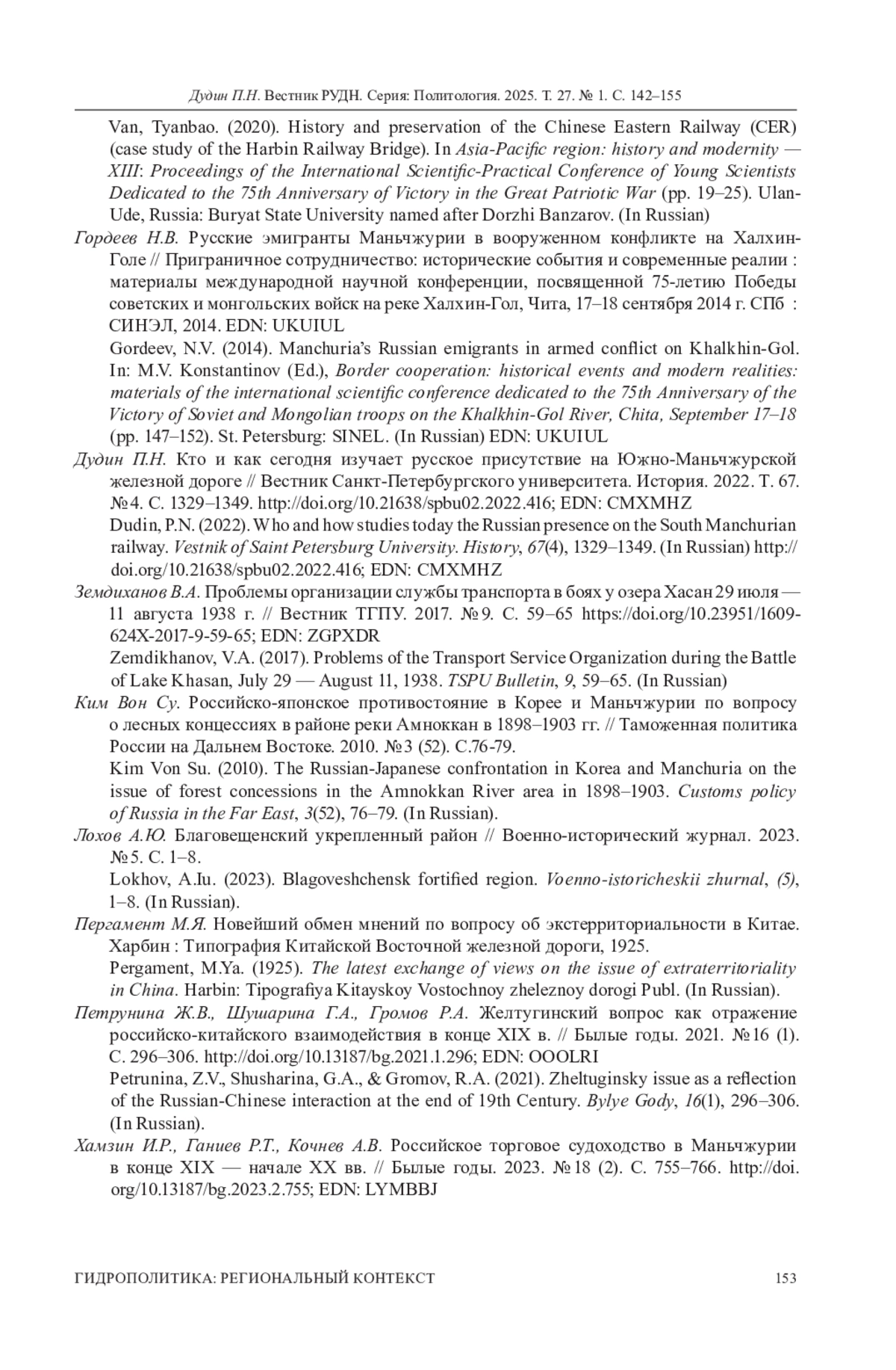 5. Дудин П.Н. Кто и как сегодня изучает русское присутствие на Южно-Маньчжурской железной дороге // Вестник Санкт-Петербургского университета. История. 2022. Т. 67. № 4. С. 1329-1349. ;. DOI: 10.21638/spbu02.2022.416 EDN: CMXMHZ