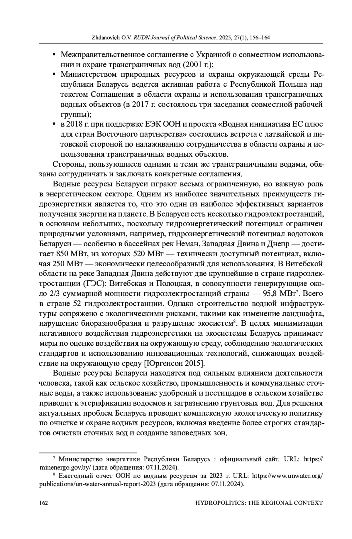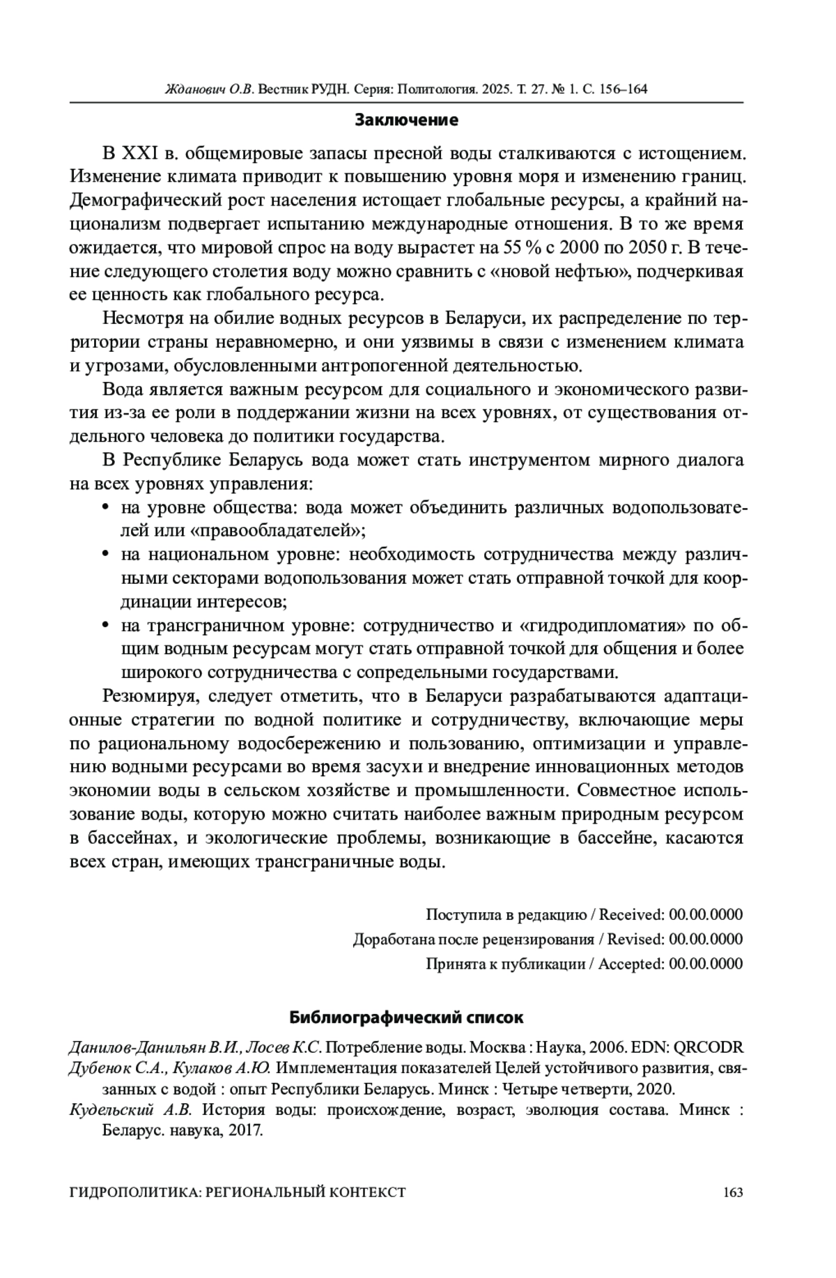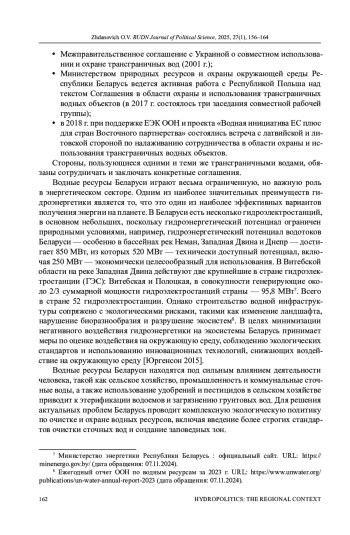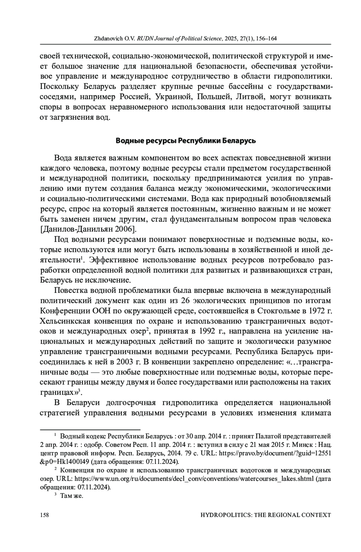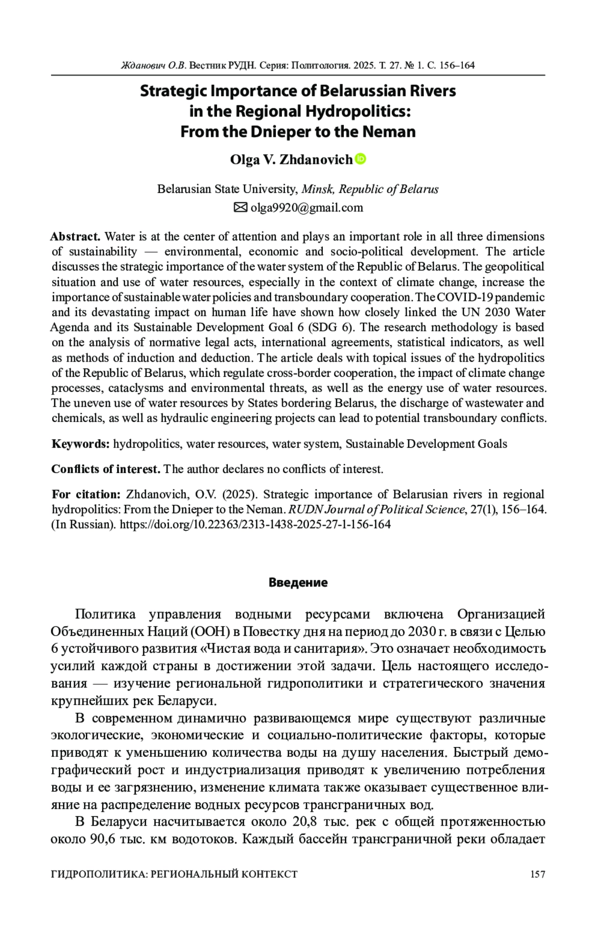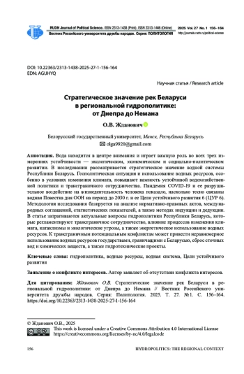 ЖДАНОВИЧ О. В. СТРАТЕГИЧЕСКОЕ ЗНАЧЕНИЕ РЕК БЕЛАРУСИ В РЕГИОНАЛЬНОЙ ГИДРОПОЛИТИКЕ: ОТ ДНЕПРА ДО НЕМАНА // ВЕСТНИК РОССИЙСКОГО УНИВЕРСИТЕТА ДРУЖБЫ НАРОДОВ. СЕРИЯ: ПОЛИТОЛОГИЯ. 2025. Т. 27 № 1