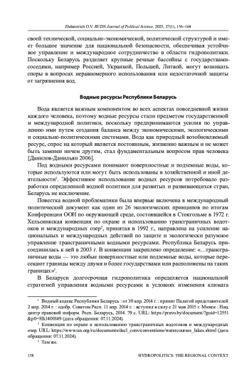 Вода находится в центре внимания и играет важную роль во всех трех измерениях устойчивости - экологическом, экономическом и социально-политическом развитии. В исследовании рассматривается стратегическое значение водной системы Республики Беларусь. Геополитическая ситуация и использование водных ресурсов, особенно в условиях изменения климата, повышают важность устойчивой водохозяйственной политики и трансграничного сотрудничества. Пандемия COVID-19 и ее разрушительное воздействие на жизнедеятельность человека показало, насколько тесно связаны водная Повестка дня ООН на период до 2030 г. и ее Цели устойчивого развития 6 (ЦУР 6). Методология исследования базируется на анализе нормативно-правовых актов, международных соглашений, статистических показателей, а также методах индукции и дедукции. В статье затрагиваются актуальные вопросы гидрополитики Республики Беларусь, которые регламентируют трансграничное сотрудничество, влияние процессов изменения климата, катаклизмы и экологические угрозы, а также энергетическое использование водных ресурсов. К трансграничным потенциальным конфликтам может привести неравномерное использование водных ресурсов государствами, граничащими с Беларусью, сброс сточных вод и химических веществ, а также гидротехнические проекты.