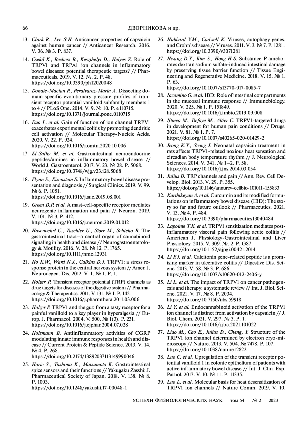 16. Duo L. et al. Gain of function of ion channel TRPV1 exacerbates experimental colitis by promoting dendritic cell activation // Molecular Therapy-Nucleic Acids. 2020. V. 22. P. 924. DOI: 10.1016/j.omtn.2020.10.006 EDN: OZNFIY