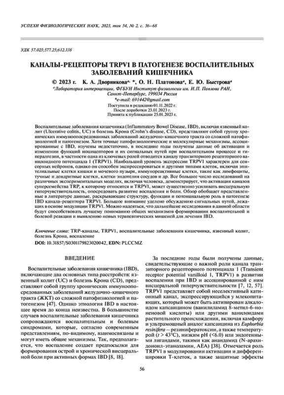 Воспалительные заболевания кишечника (Inflammatory Bowel Disease, IBD), включая язвенный колит (Ulcerative colitis, UC) и болезнь Крона (Crohn’s disease, CD), представляют собой группу хронических иммуноопосредованных заболеваний желудочно-кишечного тракта со сложной патофизиологией и патогенезом. Хотя точные патофизиологические и молекулярные механизмы, ассоциированные с IBD, изучены недостаточно, в последние годы получены данные об активации и изменении функций ноцицепторов и их сигнальных путей при воспалительном процессе и гипералгезии, в частности одна из ключевых ролей отводится каналу транзиторного рецепторного ванилоидного потенциала 1 (TRPV1). Наибольший уровень экспрессии TRPV1 характерен для сенсорных нейронов, однако он способен экспрессироваться и другими типами клеток, включая эпителиальные клетки кишки и мочевого пузыря, иммунореактивные клетки, такие как лимфоциты, тучные и дендритные клетки, клетки эндотелия сосудов и др. Все большее число исследований на различных экспериментальных моделях, включая человека, демонстрирует, что активация каналов суперсемейства TRP, к которому относится и TRPV1, может существенно усиливать висцеральную гиперчувствительность, опосредовать развитие воспаления и боли. Обзор обобщает представленные в литературе данные, раскрывающие структуру, функции и потенциальную роль в патогенезе IBD канала-рецептора TRPV1. Большое внимание уделено обсуждению сигнальных путей, лежащих в основе модуляции TRPV1. Можно надеяться, что дальнейшие исследования в данной области будут способствовать лучшему пониманию общих механизмов формирования воспалительной и болевой реакции и выявлению новых терапевтических мишеней для лечения IBD.