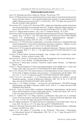 3. Бесчастнов Н.Н., Егоров К.Ю. Политика КНР в сфере регулирования рынка компьютерных игр (социальный и культурный аспекты) // Теория и практика общественного развития. 2023. № 5 (181). С. 25-30. DOI: 10.24158/tipor.2023.5.2 EDN: UJTZML