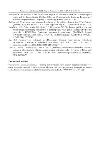 23. Volodenkov S.V., Fedorchenko S.N., Belov S.I., Karlyavina E.V. The Russian political elite and power image constructing peculiarities in contemporary video games (on the Metro Exodus materials) // ΠΡΑΞΗMΑ. Проблемы визуальной семиотики (ΠΡΑΞΗMΑ. Journal of Visual Semiotics). 2024. Вып. 2 (40). С. 57-78. DOI: 10.23951/2312-7899-2024-2-57-78 EDN: JYOENH