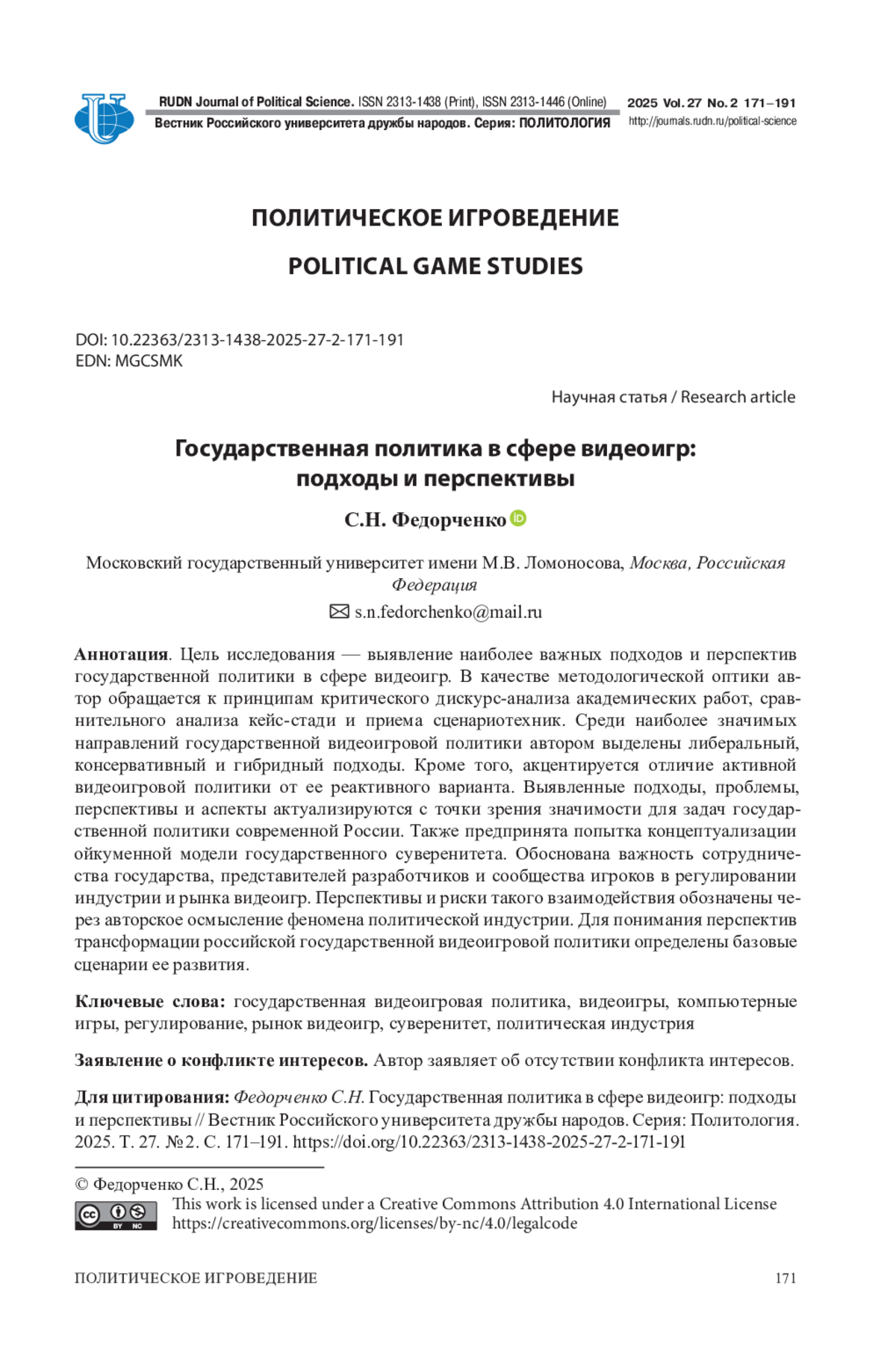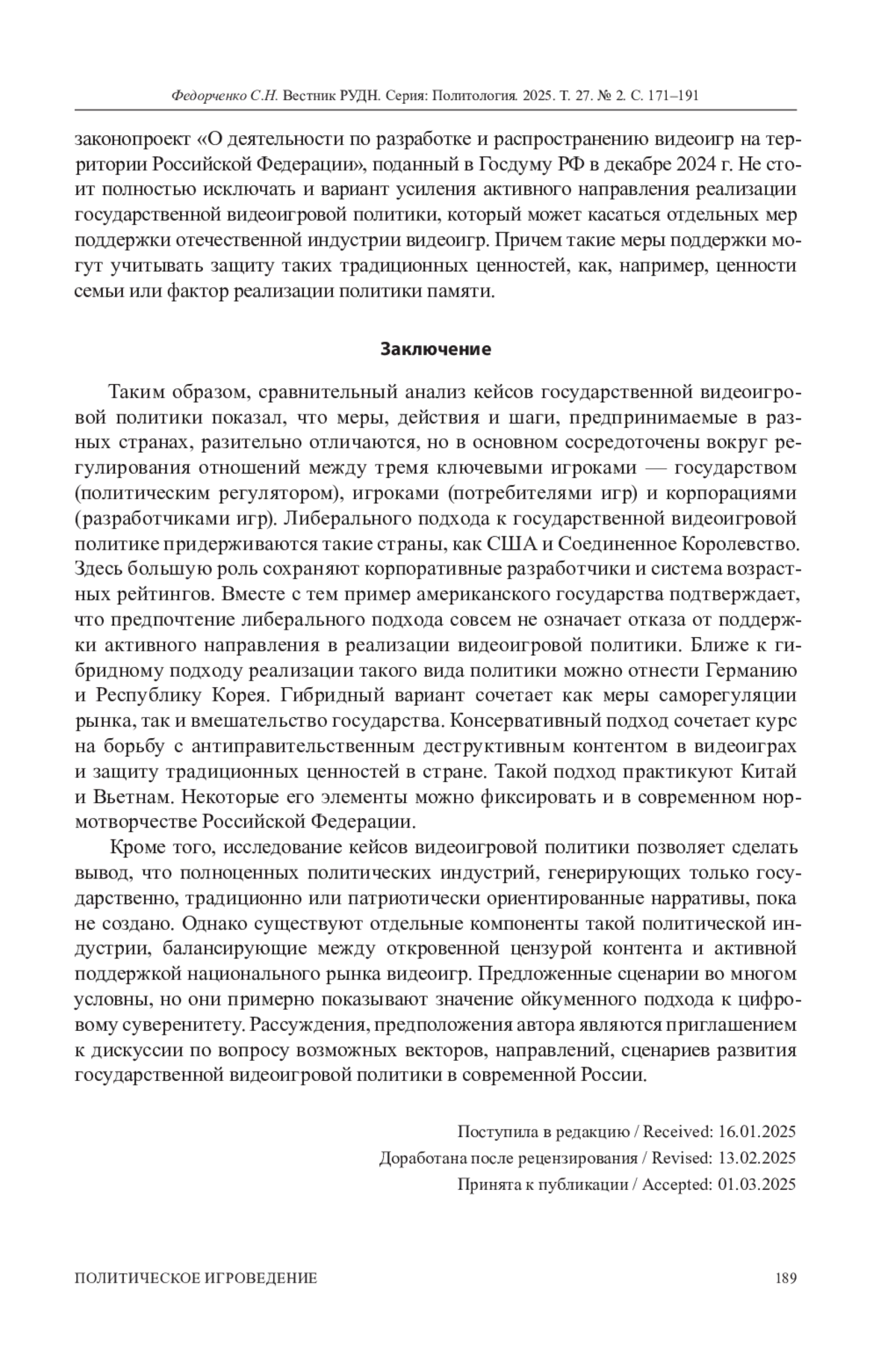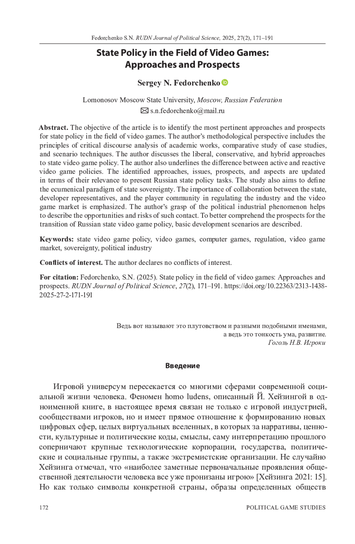 Цель исследования - выявление наиболее важных подходов и перспектив государственной политики в сфере видеоигр. В качестве методологической оптики автор обращается к принципам критического дискурс-анализа академических работ, сравнительного анализа кейс-стади и приема сценариотехник. Среди наиболее значимых направлений государственной видеоигровой политики автором выделены либеральный, консервативный и гибридный подходы. Кроме того, акцентируется отличие активной видеоигровой политики от ее реактивного варианта. Выявленные подходы, проблемы, перспективы и аспекты актуализируются с точки зрения значимости для задач государственной политики современной России. Также предпринята попытка концептуализации ойкуменной модели государственного суверенитета. Обоснована важность сотрудничества государства, представителей разработчиков и сообщества игроков в регулировании индустрии и рынка видеоигр. Перспективы и риски такого взаимодействия обозначены через авторское осмысление феномена политической индустрии. Для понимания перспектив трансформации российской государственной видеоигровой политики определены базовые сценарии ее развития.