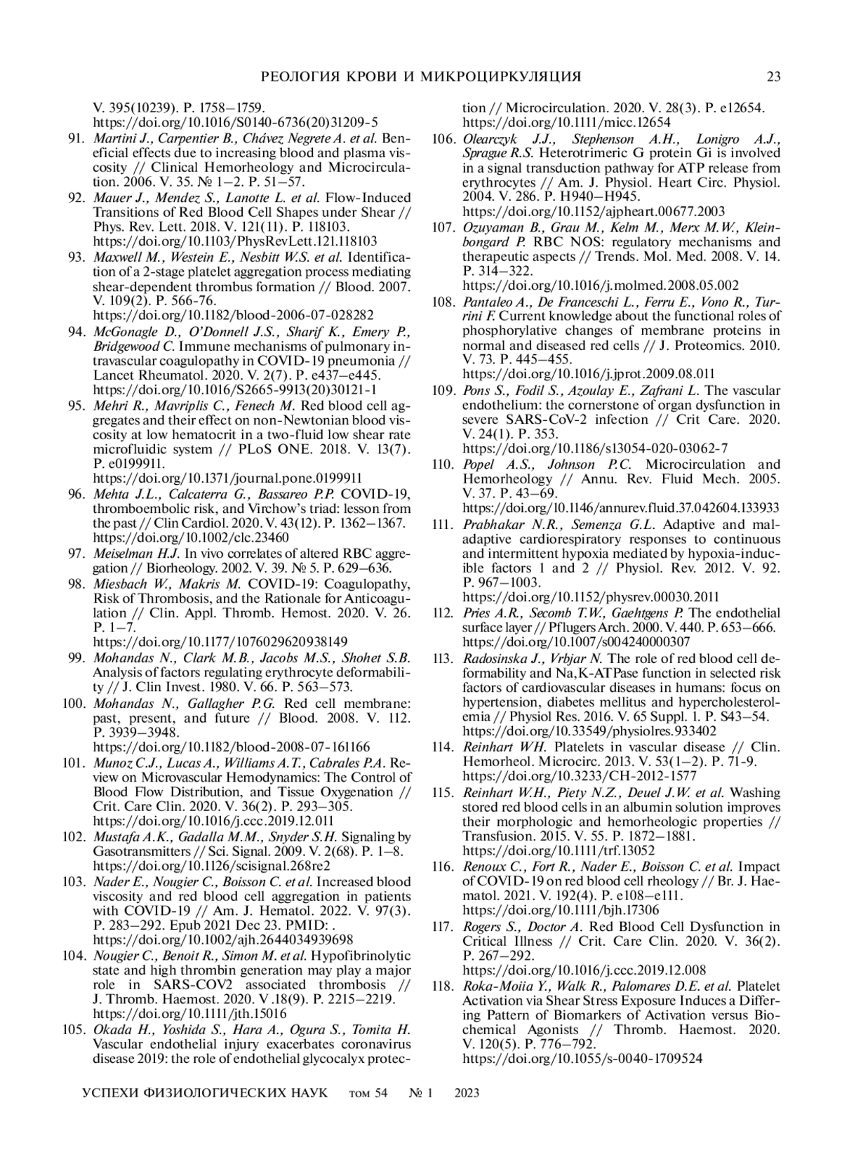 116. Renoux C., Fort R., Nader E., Boisson C. et al. Impact of COVID-19 on red blood cell rheology // Br. J. Haematol. 2021. V. 192(4). P. e108–e111. DOI: 10.1111/bjh.17306 EDN: XJHSRM