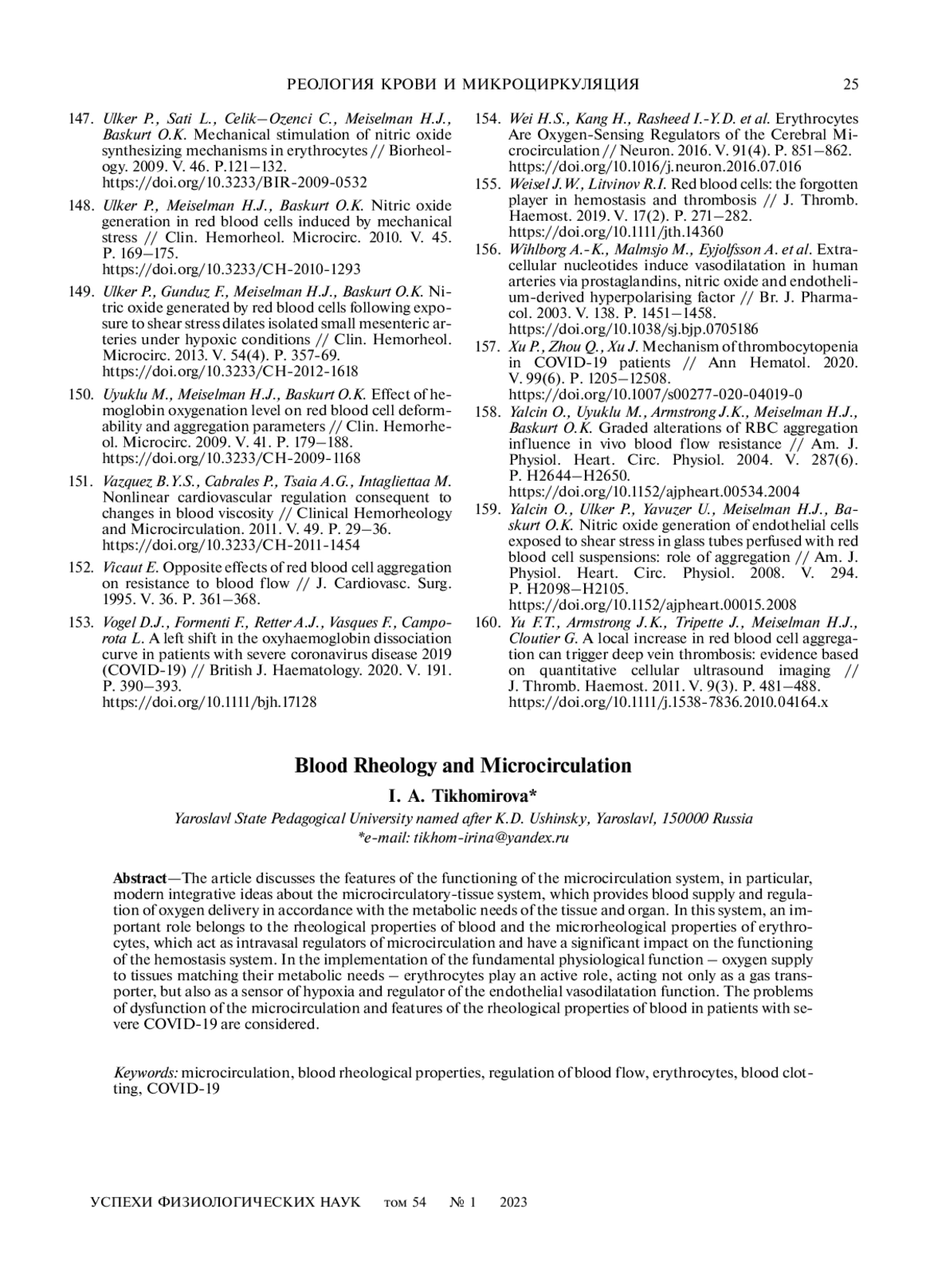 148. Ulker P., Meiselman H.J., Baskurt O.K. Nitric oxide generation in red blood cells induced by mechanical stress // Clin. Hemorheol. Microcirc. 2010. V. 45. P. 169–175. DOI: 10.3233/CH-2010-1293 EDN: MZYZIZ