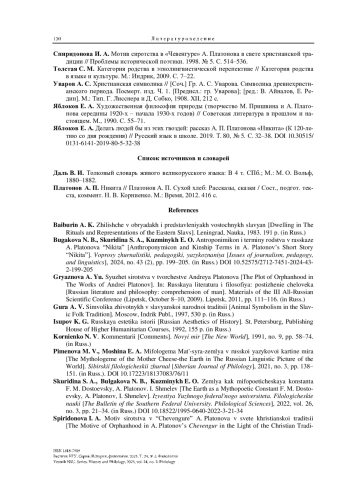 9. Скуридина С. А., Бугакова Н. Б., Кузьминых Е. О. Земля как мифопоэтическая константа Ф. М. Достоевский, А. Платонов. И. Шмелев // Изв. Южного федерального ун-та. Филологические науки. 2022. Т. 26, № 3. С. 21-34. https://doi.org/10.18522/1995-0640-2022-3-21-34