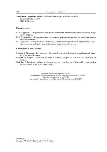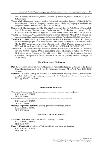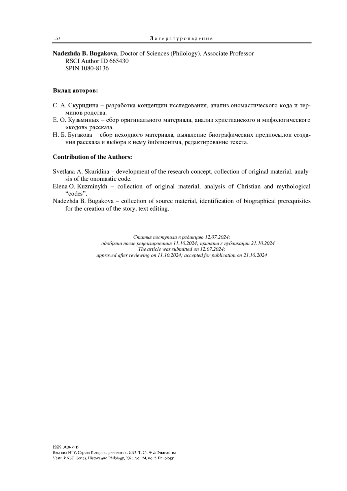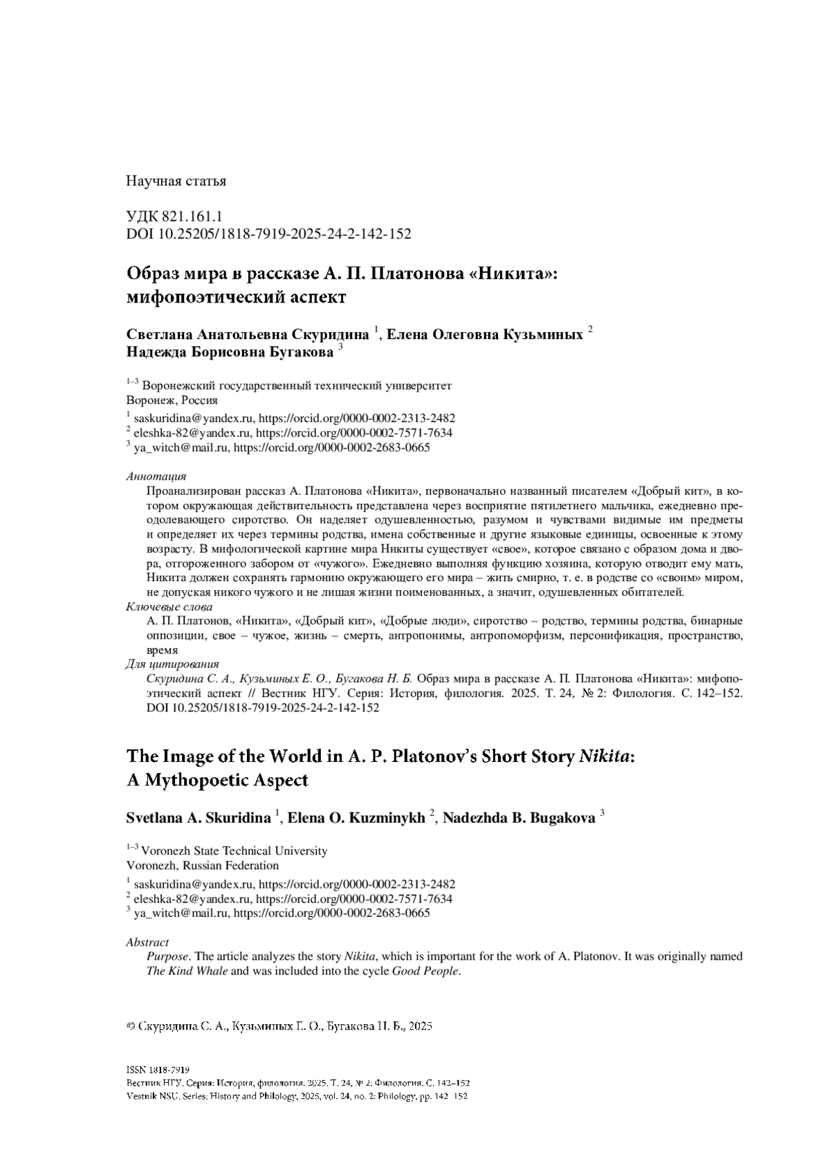 2. Бугакова Н. Б., Скуридина С. А., Кузьминых Е. О. Антропонимикон и термины родства в рассказе А. Платонова «Никита» // Вопросы журналистики, педагогики, языкознания. 2024. № 43 (2). С. 199-205. https://doi.org/10.52575/2712-7451-2024-43-2-199-205