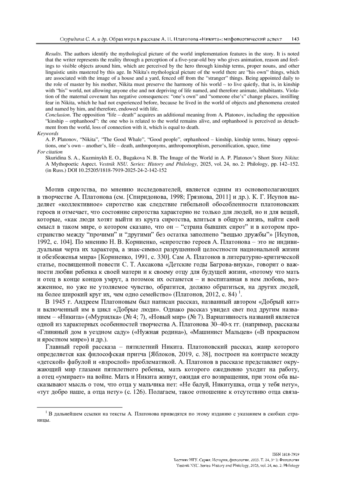 Проанализирован рассказ А. Платонова «Никита», первоначально названный писателем «Добрый кит», в котором окружающая действительность представлена через восприятие пятилетнего мальчика, ежедневно преодолевающего сиротство. Он наделяет одушевленностью, разумом и чувствами видимые им предметы и определяет их через термины родства, имена собственные и другие языковые единицы, освоенные к этому возрасту. В мифологической картине мира Никиты существует «свое», которое связано с образом дома и двора, отгороженного забором от «чужого». Ежедневно выполняя функцию хозяина, которую отводит ему мать, Никита должен сохранять гармонию окружающего его мира – жить смирно, т. е. в родстве со «своим» миром, не допуская никого чужого и не лишая жизни поименованных, а значит, одушевленных обитателей.