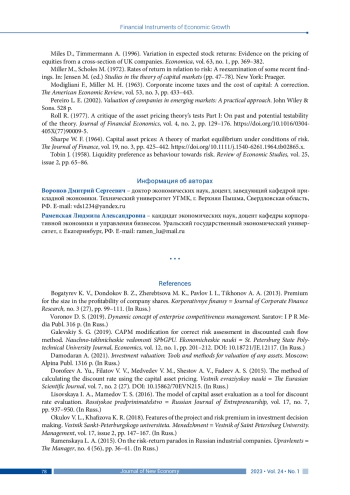 6. Лисовская И. А., Мамедов Т. С. (2016). Модель оценки капитальных активов как инструмент оценки ставки дисконтирования // Российское предпринимательство. Т. 17, № 7. С. 937-950. EDN: VWPYNJ