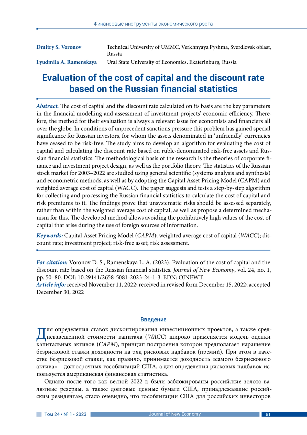 Стоимость капитала и определяемая на ее основе ставка дисконтирования являются ключевыми параметрами финансового моделирования и оценки экономической эффективности инвестиционных проектов. Поэтому методика их расчета актуальна для экономистов и финансистов всего мира, а в условиях беспрецедентного санкционного давления она приобрела особую значимость для российских инвесторов, поскольку активы, номинированные в «недружественных» валютах, перестали быть безрисковыми. Исследование направлено на разработку алгоритма оценки стоимости капитала и расчета ставки дисконтирования на базе данных о рублевых безрисковых активах и российской финансовой статистики. Методологическую основу работы составили положения теорий инвестиционного проектирования и корпоративных финансов, а также портфельной теории. Применялись общенаучные (системный анализ и синтез) и эконометрические методы исследования, модели средневзвешенной стоимости капитала (WACC) и оценки капитальных активов (CAPM). Информационной базой послужила статистика российского фондового рынка за 2003–2022 гг. Авторами предложен и апробирован пошаговый алгоритм сбора и обработки российской финансовой статистики для расчета стоимости капитала и рисковых надбавок к ней. Обоснована необходимость вынесения несистематических рисков за пределы средневзвешенной стоимости капитала, а также предложен детерминированный механизм их оценки. Разработанная методика позволяет избежать заградительно высоких значений стоимости капитала, которые возникают в ходе применения иностранных источников информации