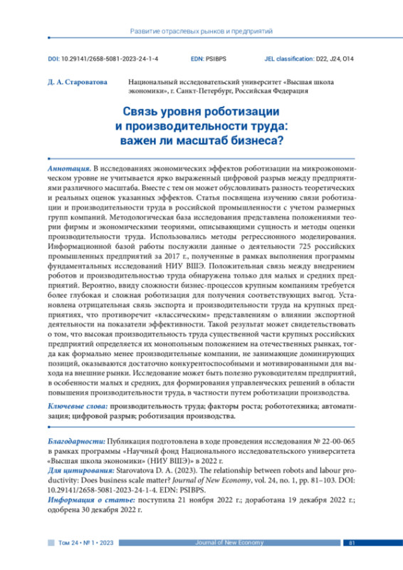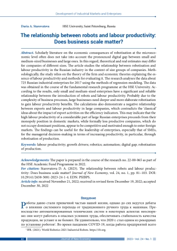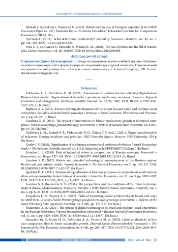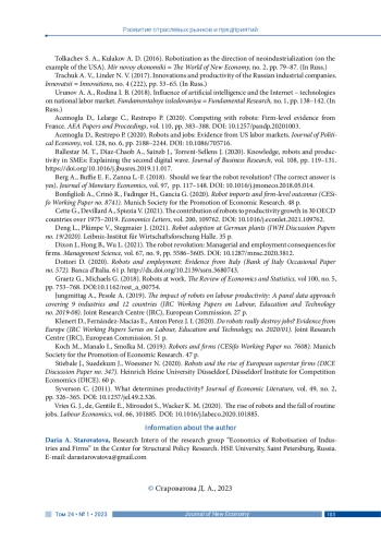 16. Acemoglu D., Lelarge C., Restrepo P. (2020). Competing with robots: Firm-level evidence from France. AEA Papers and Proceedings, vol. 110, pp. 383-388. DOI: 10.1257/pandp.20201003 EDN: FSNYUW