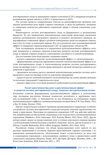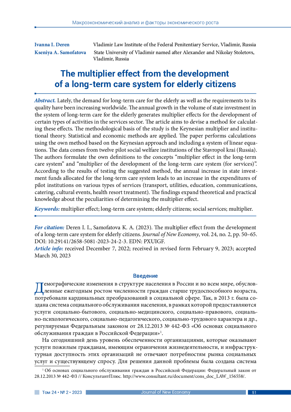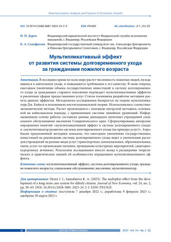 В последнее время во всем мире растет численность пожилых людей, нуждающихся в длительном уходе, и повышаются требования к его качеству. В свою очередь, ежегодное увеличение объема государственных инвестиций в систему долговременного ухода за гражданами старшего поколения порождает мультипликативные эффекты в различных сферах предоставления услуг. Статья посвящена разработке методики расчета данных эффектов. Методология исследования базируется на теории мультипликатора Дж. Кейнса и положениях институциональной теории. Использовались статистикоэкономические методы. Расчет производился с помощью авторской методики, основанной на кейнсианском подходе, с применением системы линейных уравнений. Информационную основу работы составили данные двенадцати пилотных учреждений социального обслуживания населения Ставропольского края. Сформулированы авторские определения понятий «мультипликативный эффект в системе долговременного ухода» и «мультипликатор развития системы долговременного ухода (на примере услуг)». Апробация предложенной методики показала, что ежегодное увеличение государственных инвестиций на реализацию системы долговременного ухода ведет к увеличению расходов учреждений на разные виды услуг (транспортных, коммунальных, образовательных, связи, услуг по организации питания, проведению культурных мероприятий, санаторнокурортному лечению). Результаты исследования вносят вклад в расширение теоретических и практических знаний об особенностях определения мультипликативного эффекта.