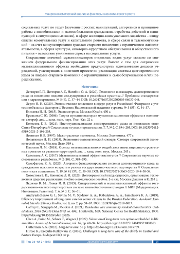 5. Колосова Г. В. (2021). Институционализация долговременного ухода за пожилыми: опыт Санкт-Петербурга // Социальные и гуманитарные знания. Т. 7, № 2. С. 194-203. 10.18255/2412- 6519-2021-2-194-203. DOI: 10.18255/2412-6519-2021-2-194-203 EDN: XENAEP