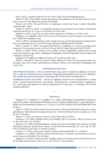 13. Andryushchenko G. I., Savina M. V., Soldatov A. A., Bikbulatova A. A., Samofatova K. A. (2019). Efficiency improvement of long-term care for senior citizens in the Russian Federation. Academic Journal of Interdisciplinary Studies, vol. 8, no. 2, pp. 58-67. DOI: 10.2478/ajis-2019-0017 EDN: IOIIWM