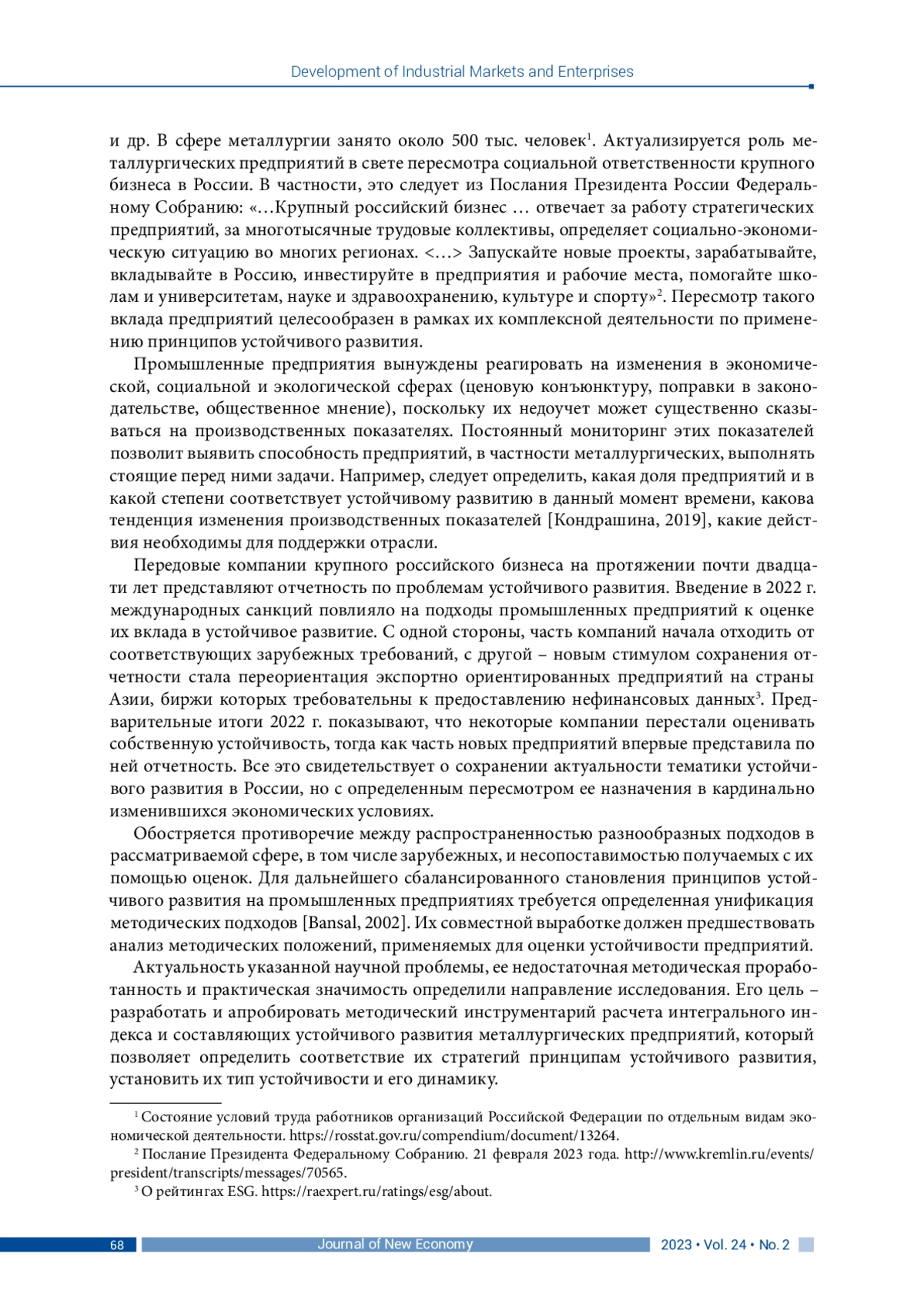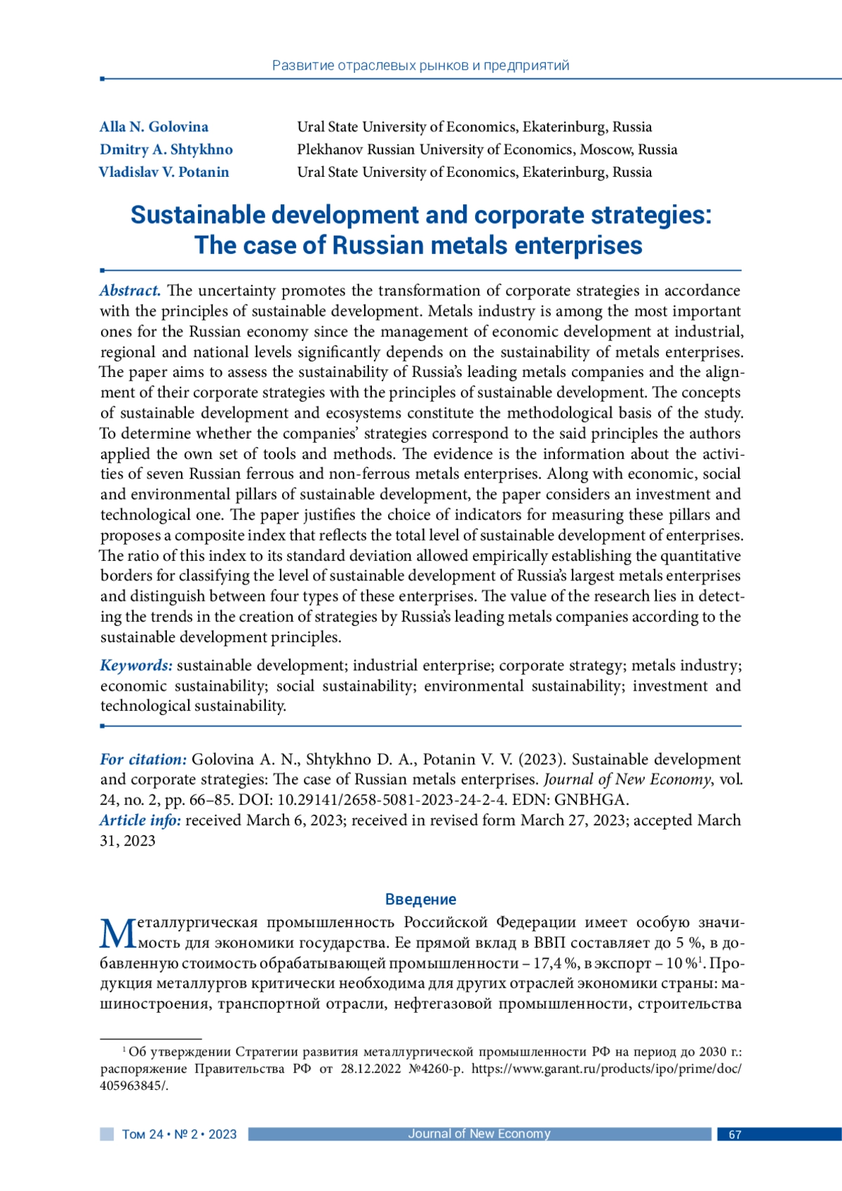 В условиях неопределенности обостряется проблема трансформации корпоративных стратегий в соответствии с принципами устойчивого развития. Металлургическая отрасль – одна из значимых для экономики России, поскольку от устойчивости ее предприятий зависит управление развитием на отраслевом, региональном и национальном уровнях. Статья посвящена оценке устойчивости ведущих российских металлургических компаний и соответствия их корпоративных стратегий принципам устойчивого развития. Методологической основой исследования являются концепции устойчивого развития и экосистем. Применялся авторский методический инструментарий оценки стратегий компаний, позволяющий определить соответствие их деятельности указанным принципам. Информационной базой послужили сведения о деятельности семи российских предприятий черной и цветной металлургии. Помимо традиционных экономической, социальной и экологической составляющих устойчивого развития рассмотрена инвестиционно-технологическая составляющая. Обоснован выбор показателей для измерения этих компонентов и предложен интегральный индекс, отражающий комплексный уровень устойчивого развития предприятий. Соотношение данного индекса и его среднего квадратичного отклонения позволило эмпирическим путем установить количественные границы для классификации уровня устойчивого развития крупнейших металлургических предприятий России и выделения четырех типов этих предприятий. Значимость исследования определяется выявлением тенденций в области формирования стратегий ведущих металлургических компаний России согласно принципам устойчивого развития