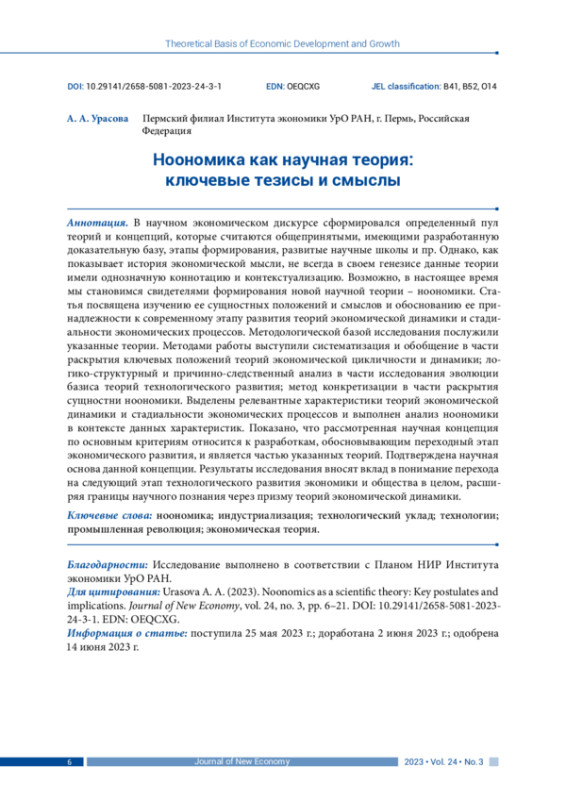 В научном экономическом дискурсе сформировался определенный пул теорий и концепций, которые считаются общепринятыми, имеющими разработанную доказательную базу, этапы формирования, развитые научные школы и пр. Однако, как показывает история экономической мысли, не всегда в своем генезисе данные теории имели однозначную коннотацию и контекстуализацию. Возможно, в настоящее время мы становимся свидетелями формирования новой научной теории – ноономики. Статья посвящена изучению ее сущностных положений и смыслов и обоснованию ее принадлежности к современному этапу развития теорий экономической динамики и стадиальности экономических процессов. Методологической базой исследования послужили указанные теории. Методами работы выступили систематизация и обобщение в части раскрытия ключевых положений теорий экономической цикличности и динамики; логико-структурный и причинно-следственный анализ в части исследования эволюции базиса теорий технологического развития; метод конкретизации в части раскрытия сущностни ноономики. Выделены релевантные характеристики теорий экономической динамики и стадиальности экономических процессов и выполнен анализ ноономики в контексте данных характеристик. Показано, что рассмотренная научная концепция по основным критериям относится к разработкам, обосновывающим переходный этап экономического развития, и является частью указанных теорий. Подтверждена научная основа данной концепции. Результаты исследования вносят вклад в понимание перехода на следующий этап технологического развития экономики и общества в целом, расширяя границы научного познания через призму теорий экономической динамики