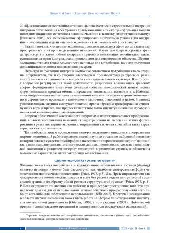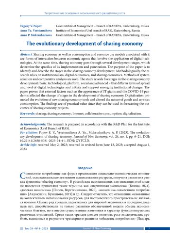 Шеринг-экономика и соответствующие ей модели потребления и использования ресурсов представляют собой формы взаимодействия экономических агентов, основанные на применении цифровых технологий. Вместе с тем развитие шеринг-экономики проходит ряд этапов, которые определяют особенности ее внедрения и распространения. Статья посвящена идентификации и характеристике периодов развития шеринг-экономики. Методологическая база исследования представлена положениями институциональной экономической теории, цифровой экономики, экономики совместного пользования. Использовались методы систематизации и компаративного анализа. В результате выделено пять этапов развития шеринг-экономики: базовый, технологический, платформенный, социальный и продвинутый, отличающиеся масштабом распространения и уровнем развития цифровых технологий, а также инициирующие и поддерживающие текущие институциональные изменения. Доказано, что на смену этапов шеринг-экономики повлияли такие внешние факторы, как появление крупных ИТ-гигантов и пандемия COVID-19. Уровень цифровизации стимулировал развитие новых инструментов шеринг-экономики, способствовал изменению характера потребления товаров и услуг. Практическая значимость полученных результатов состоит в возможности использования представленной периодизации при прогнозировании распространения проектов шеринг-экономики в отдельных сферах.