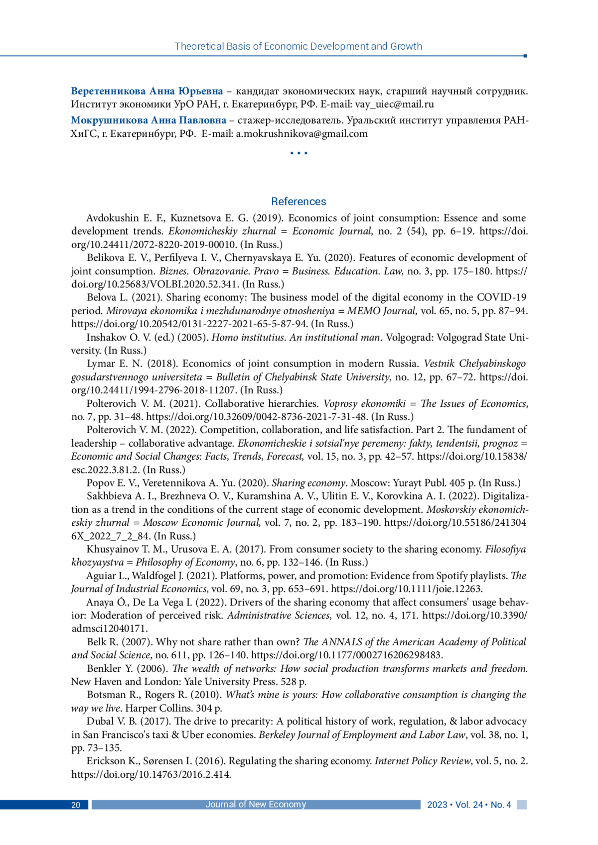 2. Авдокушин Е. Ф., Кузнецова Е. Г. (2019). Экономика совместного потребления: сущность и некоторые тенденции развития // Экономический журнал. С. 6-19. DOI: 10.24411/2072-8220-2019-00010 EDN: BUTMRL