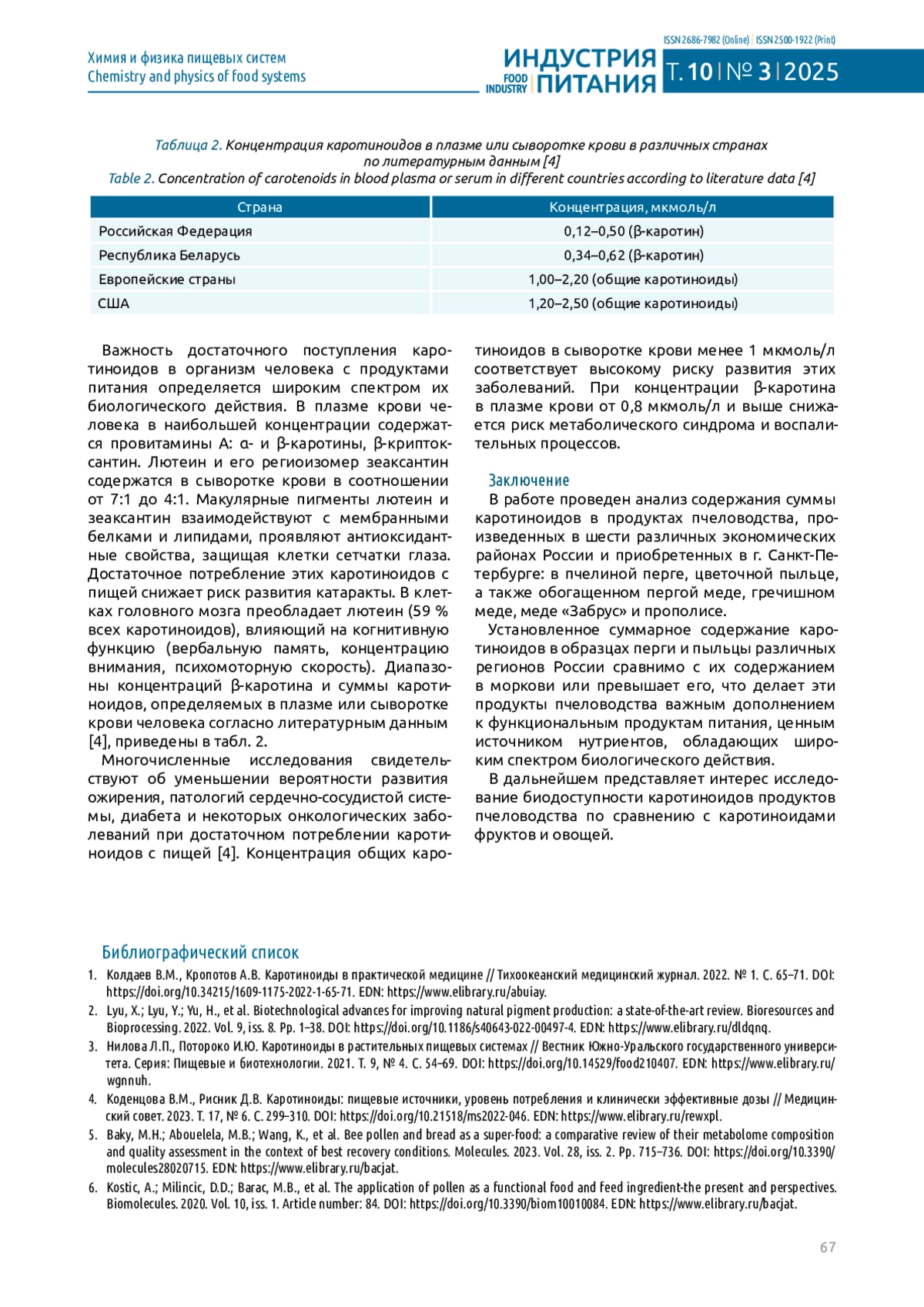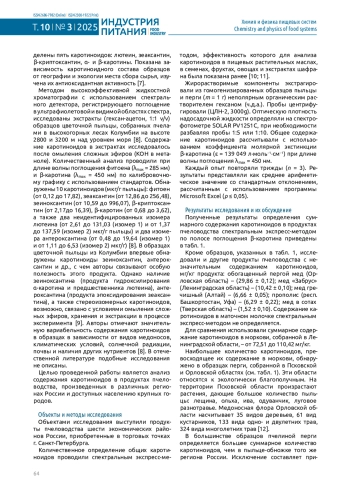 3. Нилова Л.П., Потороко И.Ю. Каротиноиды в растительных пищевых системах // Вестник Южно-Уральского государственного университета. Серия: Пищевые и биотехнологии. 2021. Т. 9, № 4. С. 54-69. 10.14529/food210407. DOI: 10.14529/food210407.EDN EDN: WGNNUH