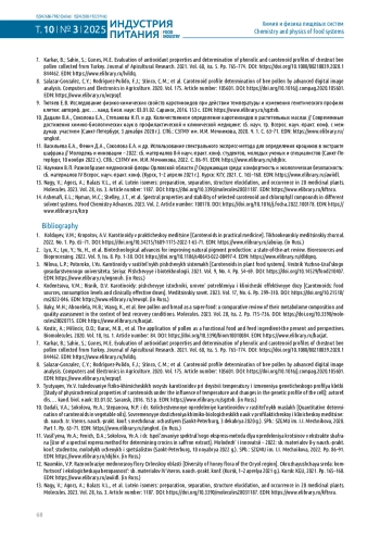 7. Karkar, B.; Sahin, S.; Gunes, М.Е. Evaluation of antioxidant properties and determination of phenolic and carotenoid profiles of chestnut bee pollen collected from Turkey. Journal of Apicultural Research. 2021. Vol. 60, iss. 5. Pp. 765-774. 10.1080/00218839.2020.1844462. DOI: 10.1080/00218839.2020.1844462.EDN EDN: LVILDQ