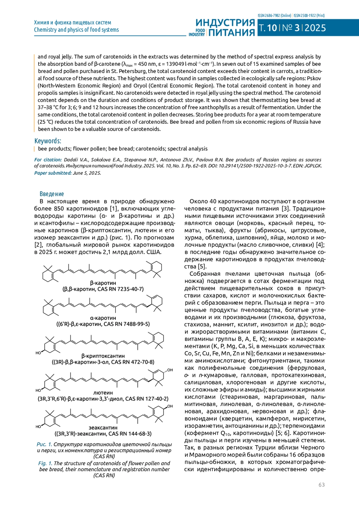 Включение собранной пчелами цветочной пыльцы-обножки и перги (ферментированной пыльцы) в функциональные продукты питания обогащает их белками, незаменимыми аминокислотами, углеводами, витаминами, микро- и макроэлементами, фитонутриентами, из которых наименее изучены каротиноиды. Их содержание зависит от географии и экологии места сбора и условий хранения продуктов, но сравнительный анализ концентрации каротиноидов в продуктах пчеловодства различных регионов нашей страны отсутствует в научной литературе. Цель работы – определение содержания каротиноидов в продуктах пчеловодства шести экономических районов России: Центрального, Северо-Западного, Западно-Сибирского, Северо-Кавказского, Уральского и Поволжского. Объекты исследования – образцы пчелиной перги, цветочной пыльцы-обножки, обогащенного пергой меда, прополиса, маточного молочка. Определение суммы каротиноидов в экстрактах проводили методом спектрального экспресс-анализа по полосе поглощения β-каротина (λmax = 450 нм, ε = 139049 л·моль −1 ·см−1 ). В семи из 15 исследованных образцов перги и пыльцы, приобретенных в Санкт-Петербурге, суммарное содержание каротиноидов превышает их содержание в моркови – традиционном пищевом источнике этих нутриентов. Наибольшее содержание обнаружено в образцах, собранных в экологически благополучных областях – Псковской (Северо-Западный экономический район) и Орловской (Центральный экономический район). В образцах меда и прополиса суммарное содержание каротиноидов незначительно. В маточном молочке спектральным методом каротиноиды не определены. Содержание каротиноидов зависит от длительности и условий хранения продукта. Показано, что термостатирование пчелиной перги при температуре 37–38 °C в течение 3; 6; 9 и 12 ч повышает концентрацию свободных ксантофилов в результате ферментации. В тех же условиях суммарное содержание каротиноидов в пыльце-обножке снижается. Хранение продуктов пчеловодства в течение года при комнатной температуре (25 °C) снижает суммарную концентрацию каротиноидов. Показано, что пчелиная перга и пыльца-обножка шести экономических районов России являются ценными источниками каротиноидов.