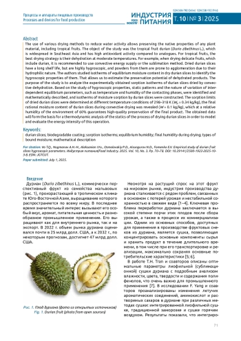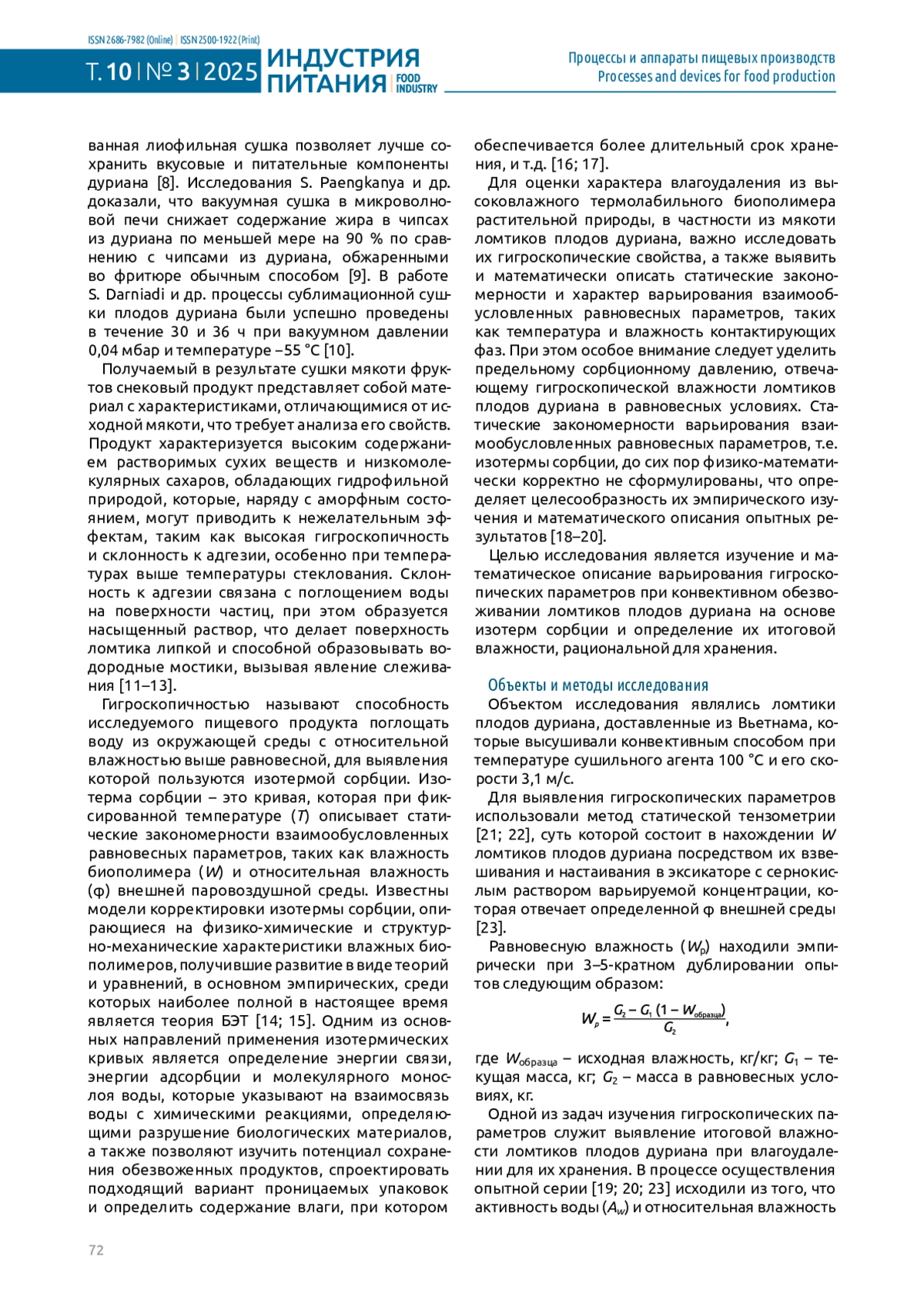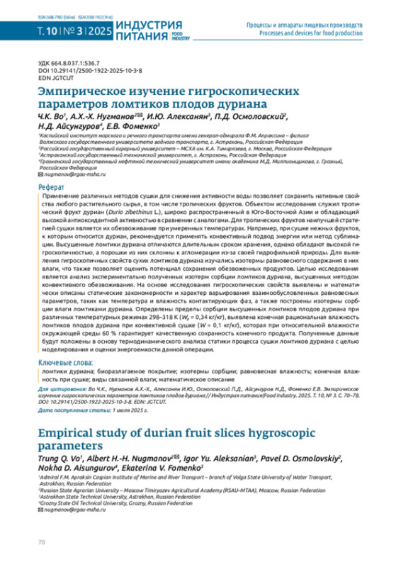 Статья: ЭМПИРИЧЕСКОЕ ИЗУЧЕНИЕ ГИГРОСКОПИЧЕСКИХ ПАРАМЕТРОВ ЛОМТИКОВ ПЛОДОВ ДУРИАНА (2025)