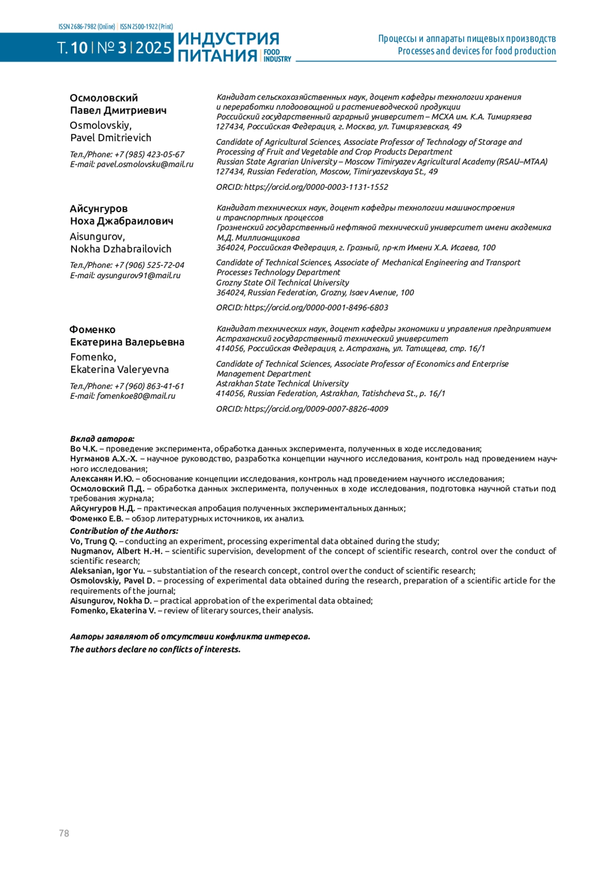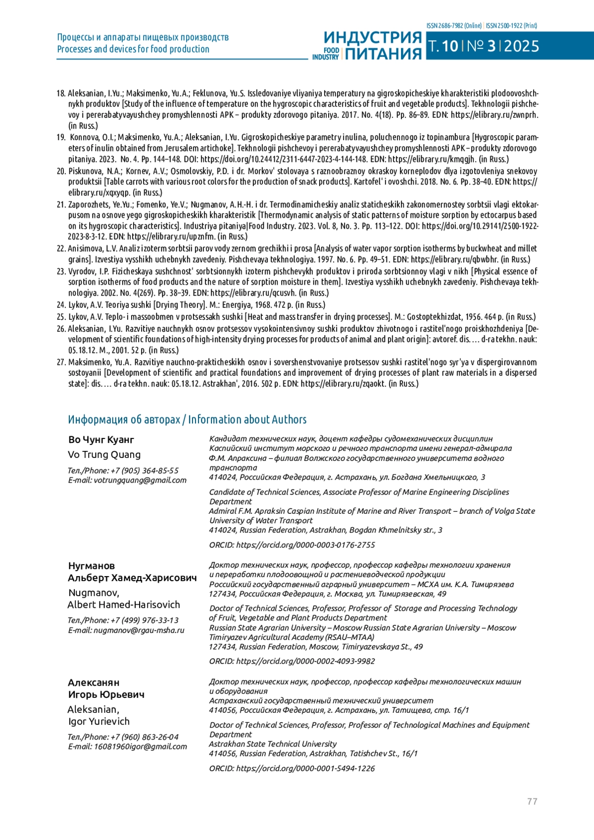 ВО Ч. К., НУГМАНОВ А. Х., АЛЕКСАНЯН И. Ю., ОСМОЛОВСКИЙ П. Д., АЙСУНГУРОВ Н. Д., ФОМЕНКО Е. В. ЭМПИРИЧЕСКОЕ ИЗУЧЕНИЕ ГИГРОСКОПИЧЕСКИХ ПАРАМЕТРОВ ЛОМТИКОВ ПЛОДОВ ДУРИАНА // ИНДУСТРИЯ ПИТАНИЯ. 2025. Т. 10 № 3