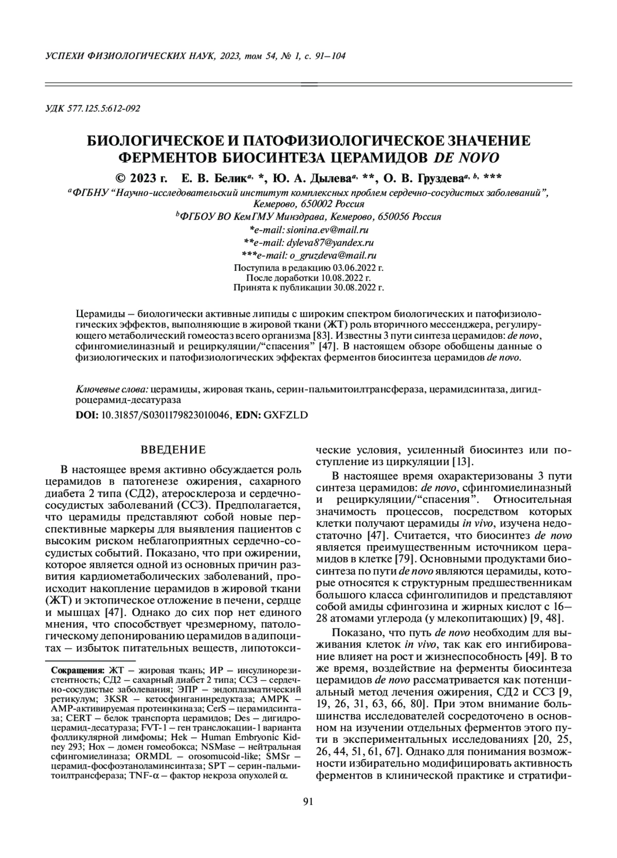 47. Li Y., Talbot C.L., Chaurasia B. Ceramides in Adipose Tissue // Front. Endocrinol. 2020. V. 11. P. 407. DOI: 10.3389/fendo.2020.00407 EDN: ZRGFQR