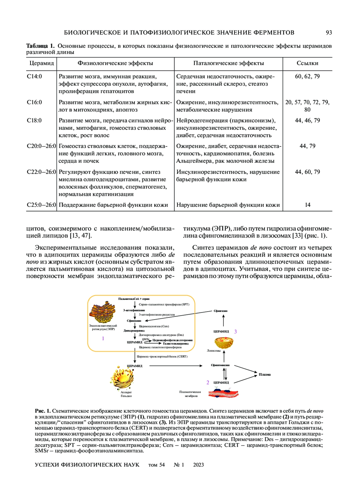 Церамиды – биологически активные липиды с широким спектром биологических и патофизиологических эффектов, выполняющие в жировой ткани (ЖТ) роль вторичного мессенджера, регулирующего метаболический гомеостаз всего организма [83]. Известны 3 пути синтеза церамидов: de novo, сфингомиелиназный и рециркуляции/“спасения” [47]. В настоящем обзоре обобщены данные о физиологических и патофизиологических эффектах ферментов биосинтеза церамидов de novo.