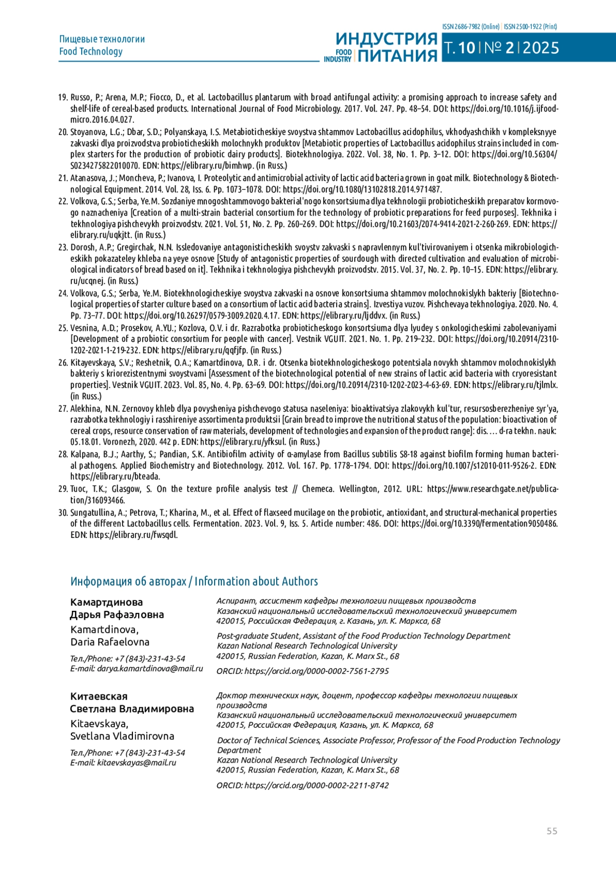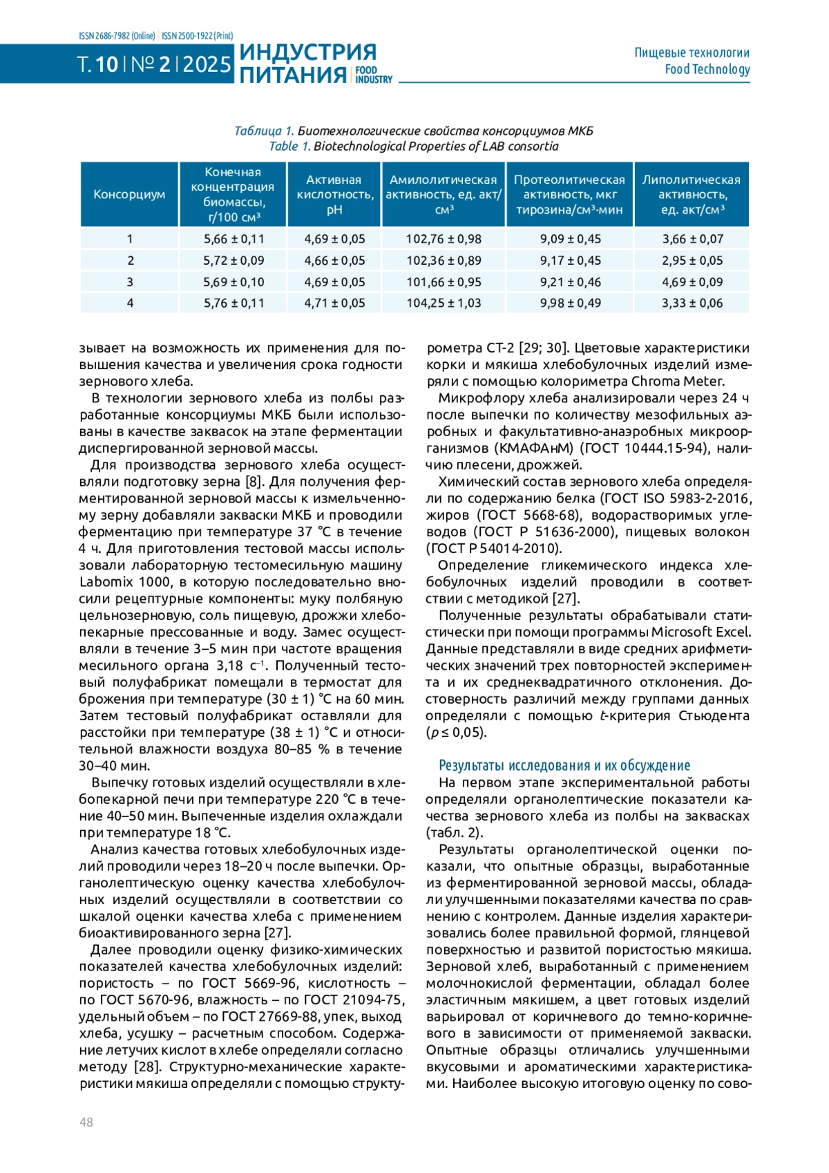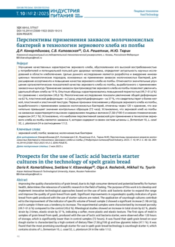 КАМАРТДИНОВА Д. Р., КИТАЕВСКАЯ С. В., РЕШЕТНИК О. А., ТЮРИН М. Ю. ПЕРСПЕКТИВЫ ПРИМЕНЕНИЯ ЗАКВАСОК МОЛОЧНОКИСЛЫХ БАКТЕРИЙ В ТЕХНОЛОГИИ ЗЕРНОВОГО ХЛЕБА ИЗ ПОЛБЫ // ИНДУСТРИЯ ПИТАНИЯ. 2025. Т. 10 № 2
