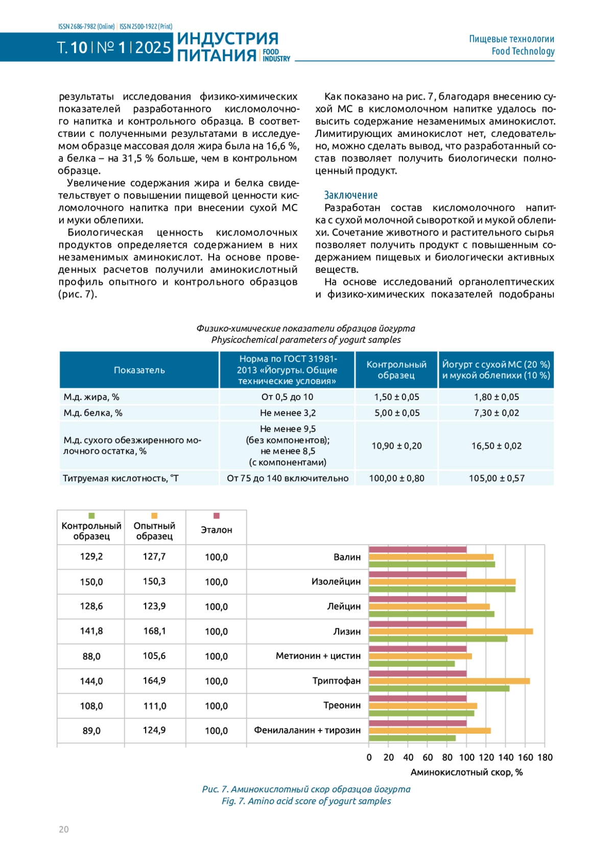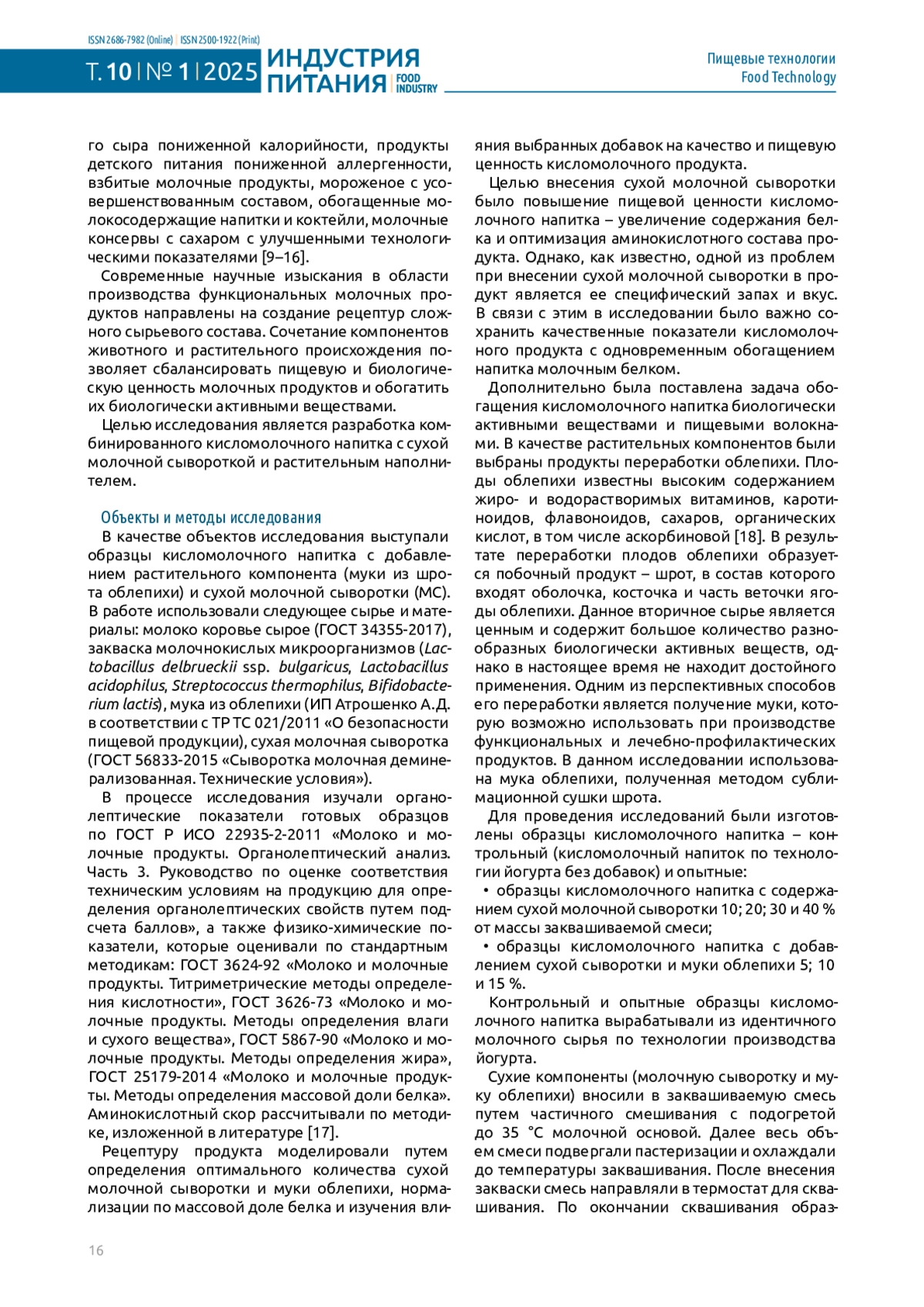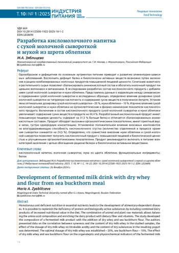 Однообразное и дефицитное по основным нутриентам питание приводит к развитию алиментарно-зависимых заболеваний. Восполнить дефицит белка и биологически активных веществ возможно путем включения в рацион комбинированных молочных продуктов повышенной пищевой ценности. Сочетание животного и растительного сырья позволяет сбалансировать аминокислотный состав и обогатить молочный продукт пищевыми волокнами и витаминами. В исследовании разработан состав кисломолочного продукта с добавлением сухой молочной сыворотки и муки облепихи. Представлены данные о корреляции между синерезисом и содержанием сухой молочной сыворотки в исследуемых образцах, определено влияние дозировки сухой молочной сыворотки на титруемую кислотность и содержание сухих веществ в полученном йогурте. Установлена оптимальная дозировка сухой молочной сыворотки – 20 %, муки облепихи – 10 %. Изучено влияние сухой молочной сыворотки и муки облепихи на органолептические и физико-химические показатели кисломолочного продукта. Включение в состав кисломолочного продукта сухой молочной сыворотки и муки облепихи увеличивает содержание сухих веществ в продукте на 44,4 %. Разработанный кисломолочный продукт имеет повышенную пищевую ценность: содержит на 31,5 % больше белка и отличается сбалансированным аминокислотным составом. Продукт обладает высокими органолептическими показателями, имеет приятный вкус и запах, густую однородную консистенцию. Установлено положительное влияние вносимых компонентов на влагоудерживающую способность кисломолочного сгустка (количество отделяемой в процессе хранения сыворотки снижается на 24,5 %). Определено, что совместное внесение муки облепихи и сухой молочной сыворотки позволяет получить кисломолочный продукт с повышенной пищевой и биологической ценностью и улучшенными органолептическими показателями. Продукт рекомендуется включать в питание всех категорий населения с целью обогащения рациона белком и биологически активными веществами.
