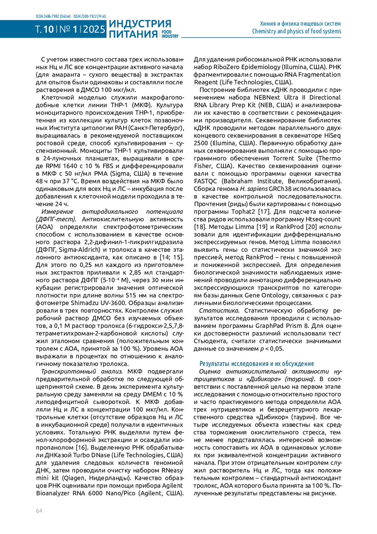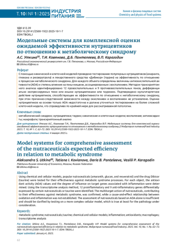 С помощью химической и клеточной моделей проведено тестирование популярных нутрицевтиков (амаранта, глюкана и ресвератрола) и лекарственного средства «Дибикор» (таурин) на эффективность по отношению к процессам метаболического синдрома. Для каждого объекта определены величины антиокислительной активности (АОА) и степень влияния на гены-мишени, ассоциированные с воспалением. Методом транскриптомного анализа идентифицировано 12 провоспалительных и 9 противовоспалительных генов, дифференциально экспрессируемых теми или иными нутрицевтиками или таурином. Подтверждено мультитаргетное действие нутрицевтиков, способствующее их эффективности по отношению к метаболическому синдрому, при этом причинно-следственной зависимости между окислением и воспалением не установлено. Оценка нутрицевтиков на основе только АОА недостаточна и должна уточняться тестированием на более сложной клеточной модели, что справедливо по крайней мере для рассматриваемой патологии.
