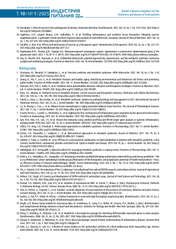 5. Fahed, G., Aoun, L., Bou Zerdan, M., et al. Metabolic syndrome: updates on pathophysiology and management in 2021.International Journal of Molecular Sciences. 2022. Vol. 23, Iss. 2. Article Number: 786. DOI: 10.3390/ijms23020786 EDN: NKHLKM