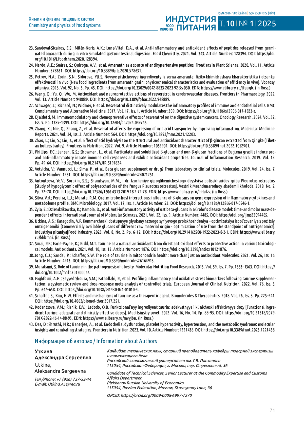25. Петров Н.А., Зорин С.Н., Сидорова Ю.С. Новые пищевые ингредиенты из зерна амаранта: физико-химическая характеристика и оценка эффективности in vivo // Вопросы питания. 2023. Т. 92, № 5. C. 45. 10.33029/0042-8833-2023-92-5s-030. DOI: 10.33029/0042-8833-2023-92-5s-030.EDN EDN: TFAUQB