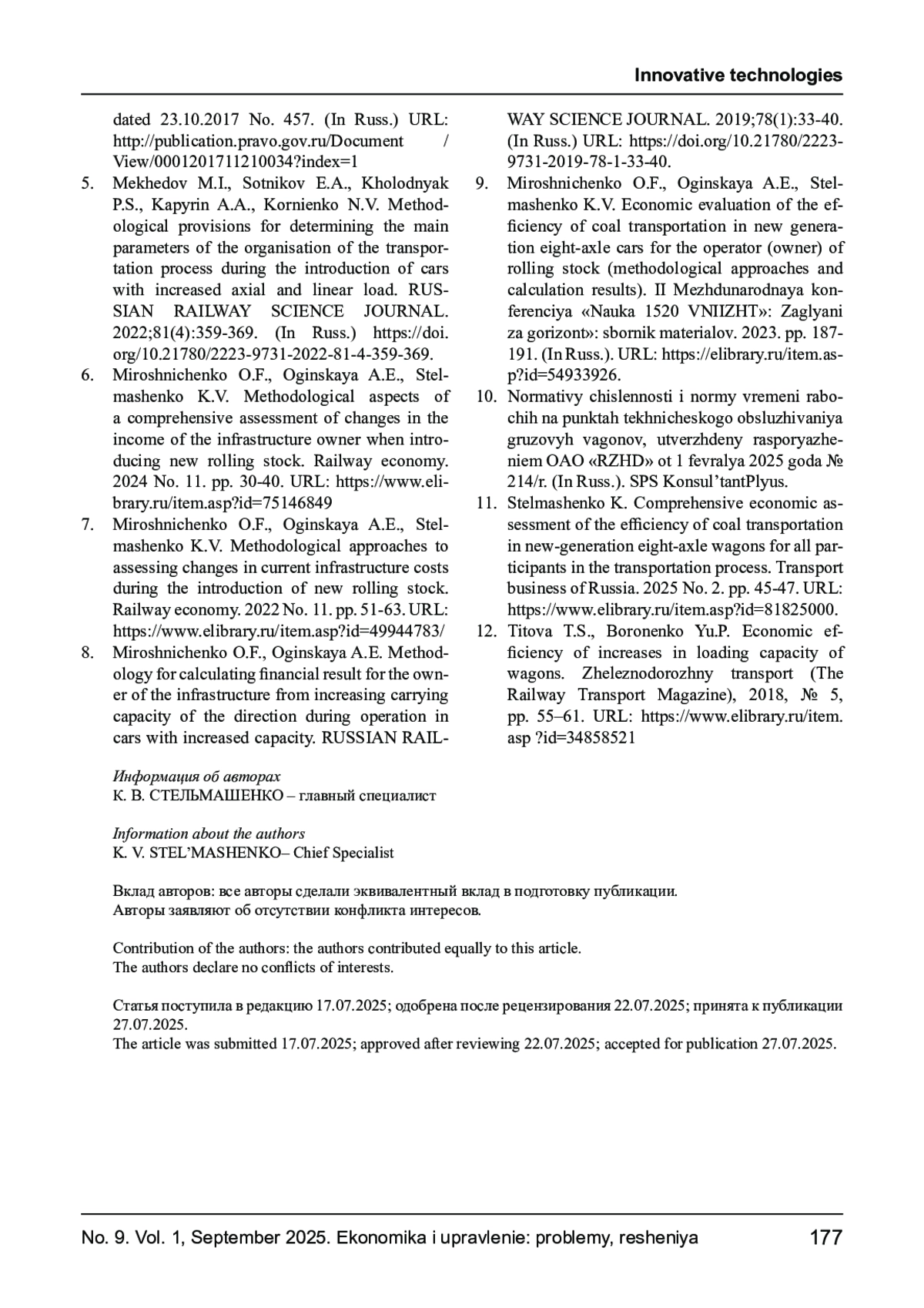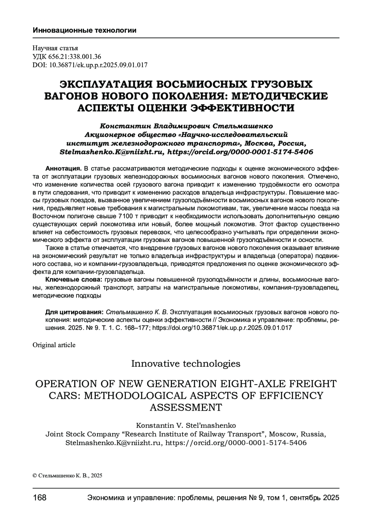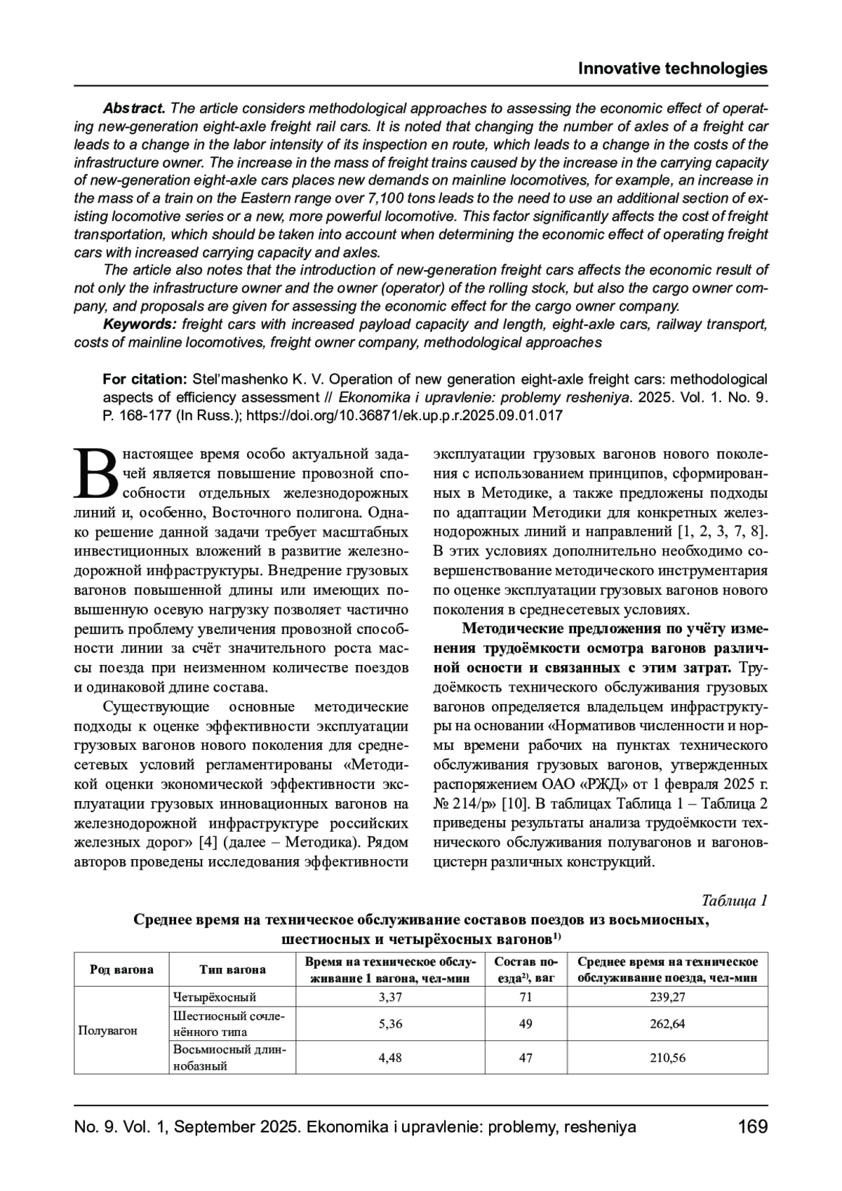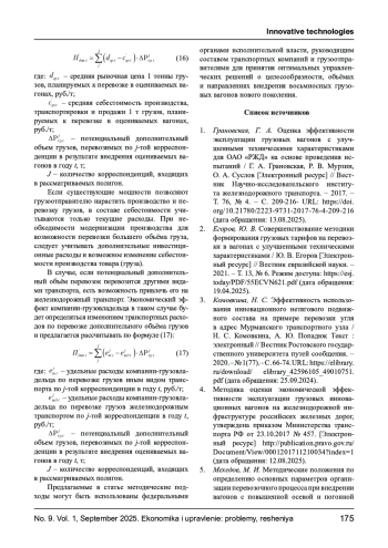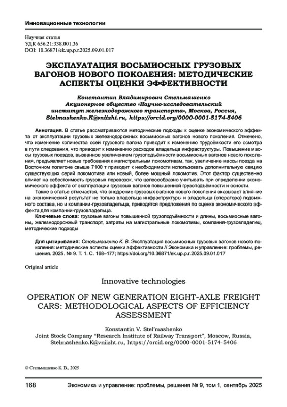 СТЕЛЬМАШЕНКО К. В. ЭКСПЛУАТАЦИЯ ВОСЬМИОСНЫХ ГРУЗОВЫХ ВАГОНОВ НОВОГО ПОКОЛЕНИЯ: МЕТОДИЧЕСКИЕ АСПЕКТЫ ОЦЕНКИ ЭФФЕКТИВНОСТИ // ЭКОНОМИКА И УПРАВЛЕНИЕ: ПРОБЛЕМЫ, РЕШЕНИЯ. 2025. ТОМ 1 № 9