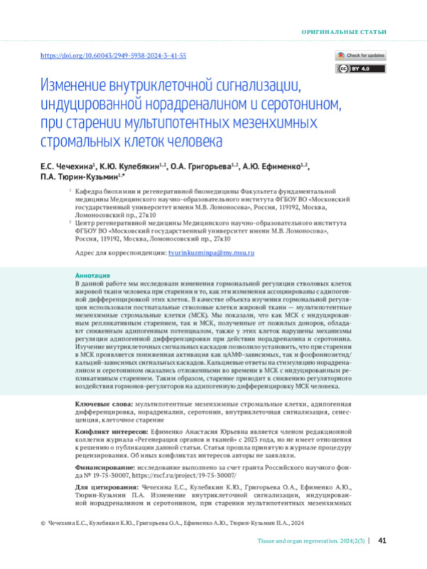 В данной работе мы исследовали изменения гормональной регуляции стволовых клеток жировой ткани человека при старении и то, как эти изменения ассоциированы с адипогенной дифференцировкой этих клеток. В качестве объекта изучения гормональной регуляции использовали постнатальные стволовые клетки жировой ткани — мультипотентные мезенхимные стромальные клетки (МСК). Мы показали, что как МСК с индуцированным репликативным старением, так и МСК, полученные от пожилых доноров, обладают сниженным адипогенным потенциалом, также у этих клеток нарушены механизмы регуляции адипогенной дифференцировки при действии норадреналина и серотонина. Изучение внутриклеточных сигнальных каскадов позволило установить, что при старении в МСК проявляется пониженная активация как цАМФ-зависимых, так и фосфоинозитид/ кальций-зависимых сигнальных каскадов. Кальциевые ответы на стимуляцию норадреналином и серотонином оказались отложенными во времени в МСК с индуцированным репликативным старением. Таким образом, старение приводит к снижению регуляторного воздействия гормонов-регуляторов на адипогенную дифференцировку МСК человека.